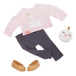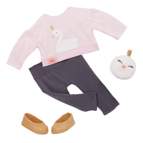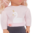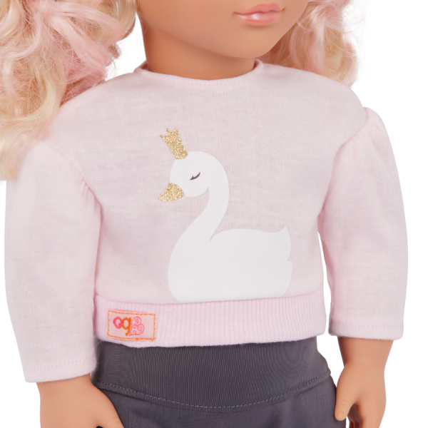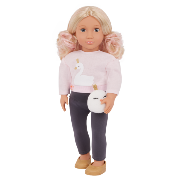 Fashion lovers and animal fans will have a swander-ful time styling Our Generation 18-inch doll Eliana! She has a huggable soft body and lifelike features. Her unique gray eyes open and close, and her long, wavy blonde hair is fun to style. Especially with her cotton candy pink peekaboo highlights! Eliana loves swans. And she lets it shine in her one-of-a-kind outfit. She arrives wearing a glittery swan-print sweatshirt with a pair of leggings and comes with a swan plush accessory. When it’s time for dress-up, her outfit has easy-open closures to quickly put on and remove. So you can mix, match, and create more of your favorite looks!
