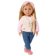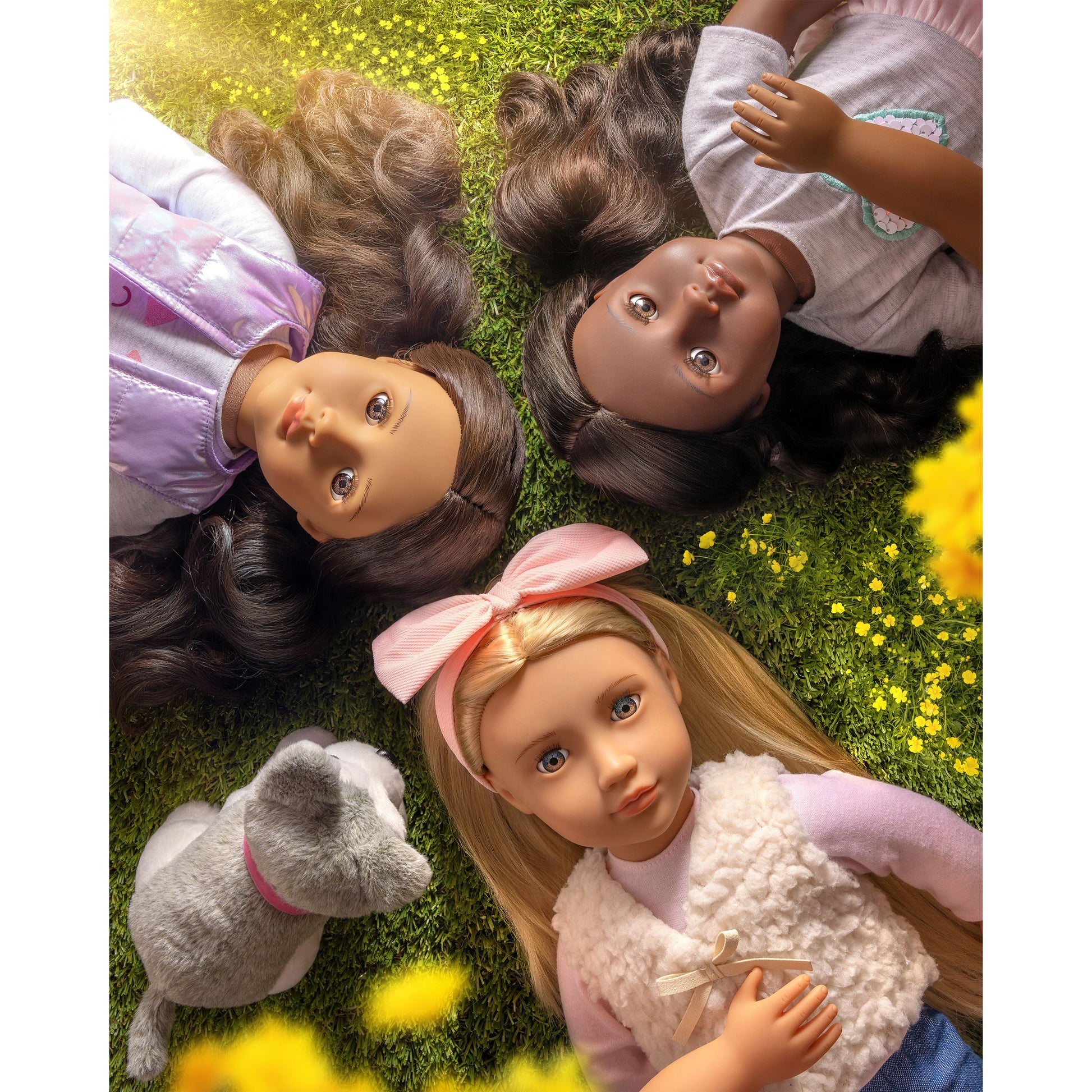 Inspire friendship and fashion fun with Our Generation 18-inch doll Emmie! She wears a stylish outfit in cute shades of blue and pink, featuring a faux-shearling vest and bow headband for extra dress-up and styling play. Emmie has a huggable soft body and lifelike features that will delight doll fans during playtime. Her beautiful blue eyes open and close, and her long, light-blonde hair is fun to style in many ways! For kids who love dress-up, her outfit has easy-open closures to quickly put on and remove. So they can mix, match, and create even more styles on new adventures! Our Generation dolls make a great gift for kids ages 3+ (small parts), encouraging them to imagine their own unique stories.