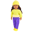 Friendship and fashion shine bright with Our Generation 18-inch doll Sola! Dressed in vibrant colors, she wears a yellow top with a faux-fur trim, a matching beanie hat, purple pants, and yellow shoes that complete this cute "color blocking" effect. Color-blocking outfits let creative fashion fans add cheery colors to their doll's wardrobe as they explore storytelling and self-expression. Sola has a huggable soft body and lifelike features that will delight doll fans during playtime. Her beautiful hazel eyes open and close, and her wavy brown hair has purple peekaboo highlights for extra bright styles! When it's time for dress-up, her outfit has easy-open closures to quickly put on and remove. So you can mix, match, and create even more stylish looks on any adventure! Our Generation dolls make a great gift for kids ages 3+ (small parts), encouraging them to imagine their own unique stories.