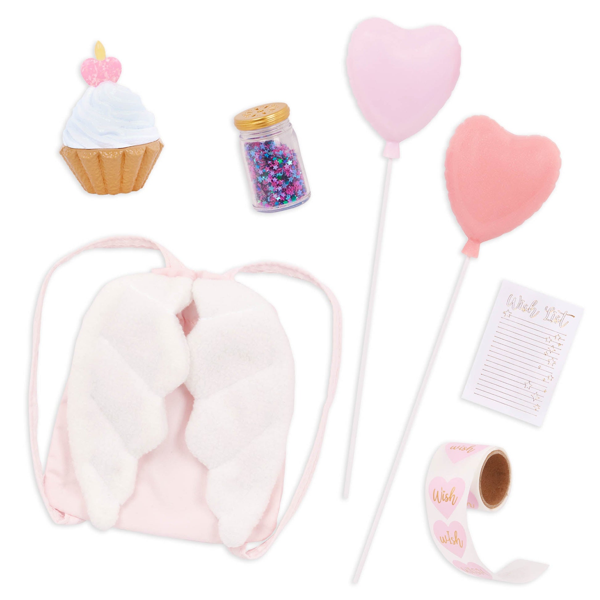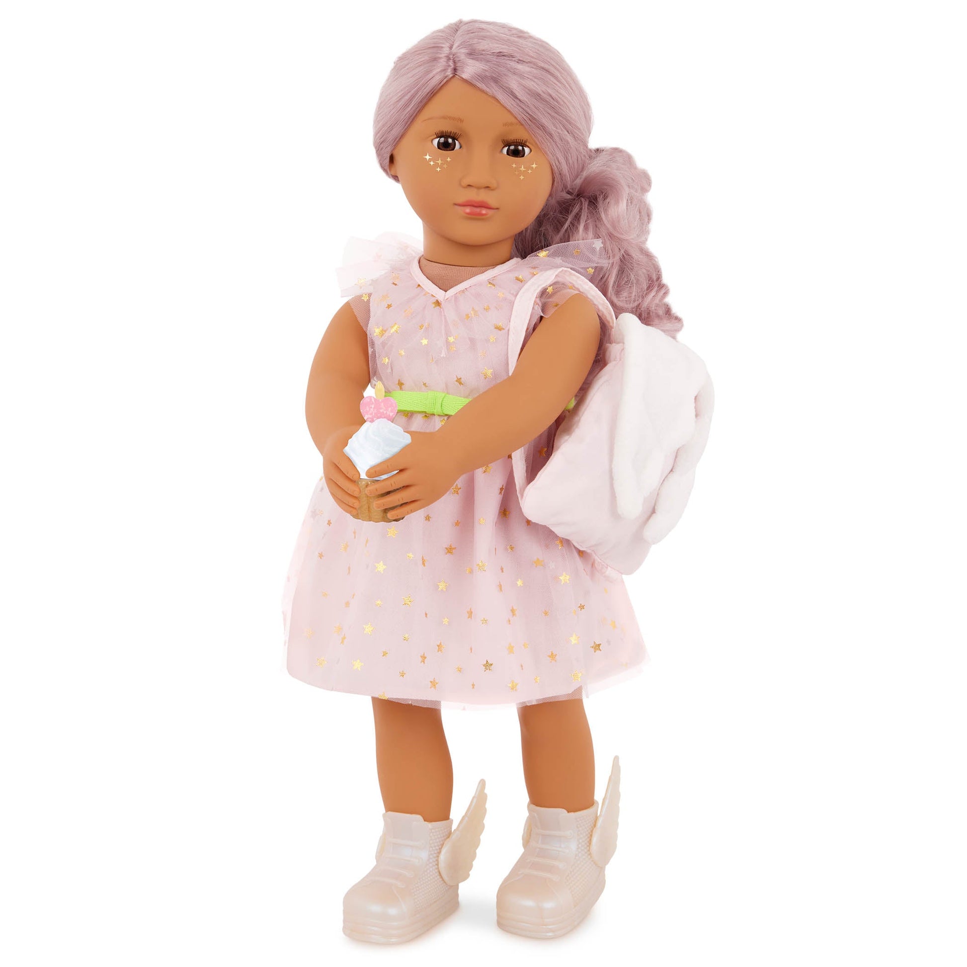Little ones can dream big and create endless magical adventures with Our Generation doll Wishes! This enchanting 18-inch doll has a huggable soft body, star-like freckles on her cheeks, and lifelike features to delight doll fans during playtime. Her beautiful dark-brown eyes open and close, and her long, wavy pink hair is fun to style in many ways! Ready to make your first wish? Wishes comes with a wish list, a “magic” jar, and real stickers for kids to make big wishes, little wishes, and surprise wishes come true! Plus, she has bonus play pieces like 2 balloons, a cupcake, and a backpack to hold her accessories. She wears a charming star-print dress with ruffle sleeves, a lime green waistbelt, a shooting star bracelet, and high-top shoes with 3D wings. When it’s time for dress-up, her outfit has easy-open closures to quickly put on and remove. So you can mix, match, and create even more stylish looks! Our Generation dolls make a great gift for kids ages 3+ (small parts), encouraging them to imagine their own unique stories.