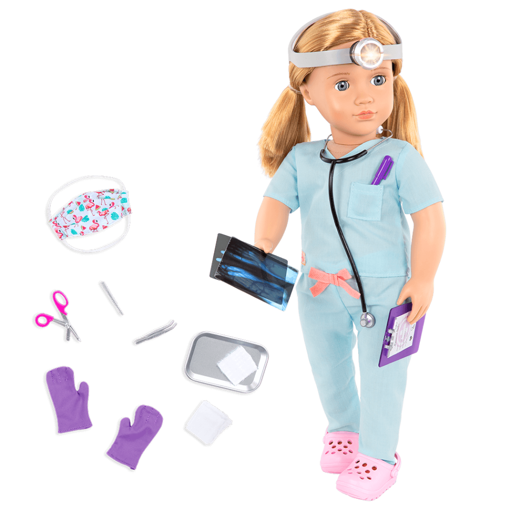 Help your friends get back to happy health with the Our Generation 18-inch doctor doll Tonia! This sweet surgeon has bright blue eyes that open and close, and her long blonde hair is fun to brush and style. She can also rotate her arms and legs to give her patients the best care with the realistic accessories! Put on Tonia’s face mask and the pair of purple gloves for added safety, then light up her headlamp with the push of a button! The stethoscope comfortably fits in Tonia’s ears to listen to her patient’s heartbeats, and you can fill out the medical form once the checkup is all done! Tonia’s scrubs outfit features easy-open closures that make it quick to put on and remove, so you can easily change her into many colorful outfits to join her friends on more fun adventures!