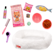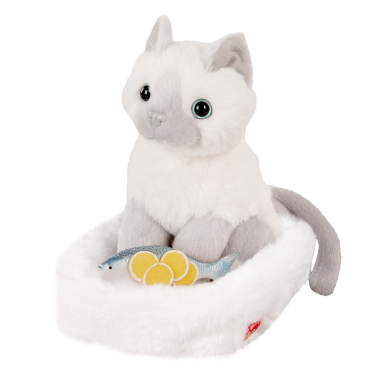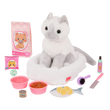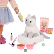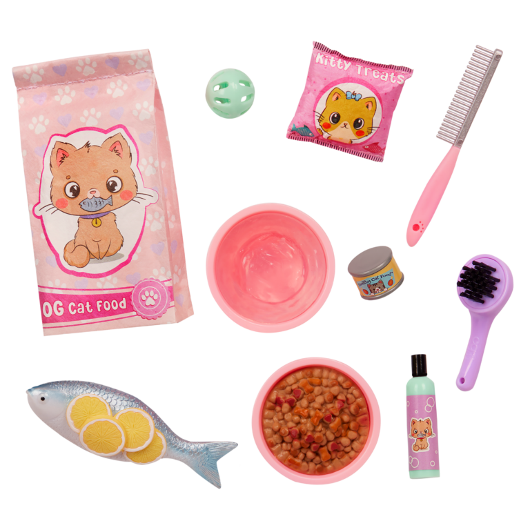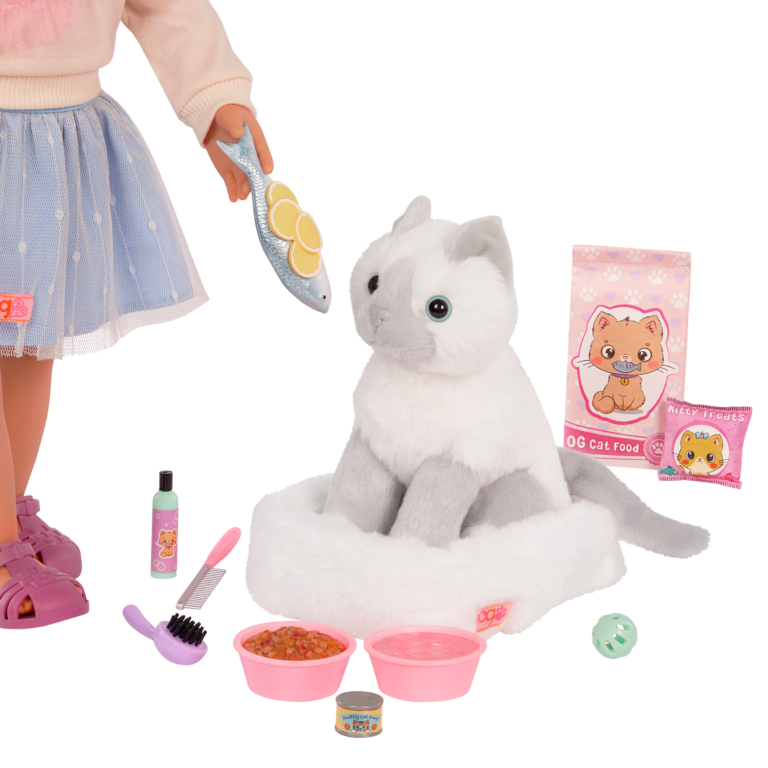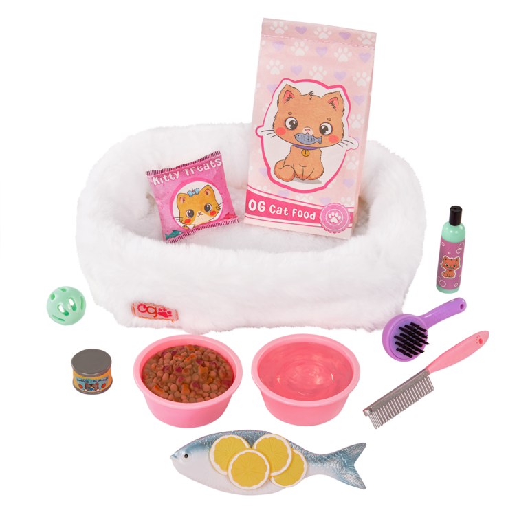 The Our Generation Feline Fabulous set for 18-inch dolls has everything animal fans need to take purrfect care of their favorite kitty! Set up a stylish spot for your best furry friend to dream, eat, and get pampered with the cute pet bed. It’s made of soft white plush for extra cozy cat naps. Is today a canned food day or a full fish day? The realistic play food items gives kids a variety of options to choose from (especially for finicky kitties!). Plus, themed accessories like the bottle of shampoo, comb, and brush open up lots of grooming and storytelling. Makes a fun addition to pet sets and doll collections. Our Generation doll accessories are a great gift for kids ages 3+ (small parts), encouraging them to imagine their own unique stories. Our Generation dolls and pets sold separately.