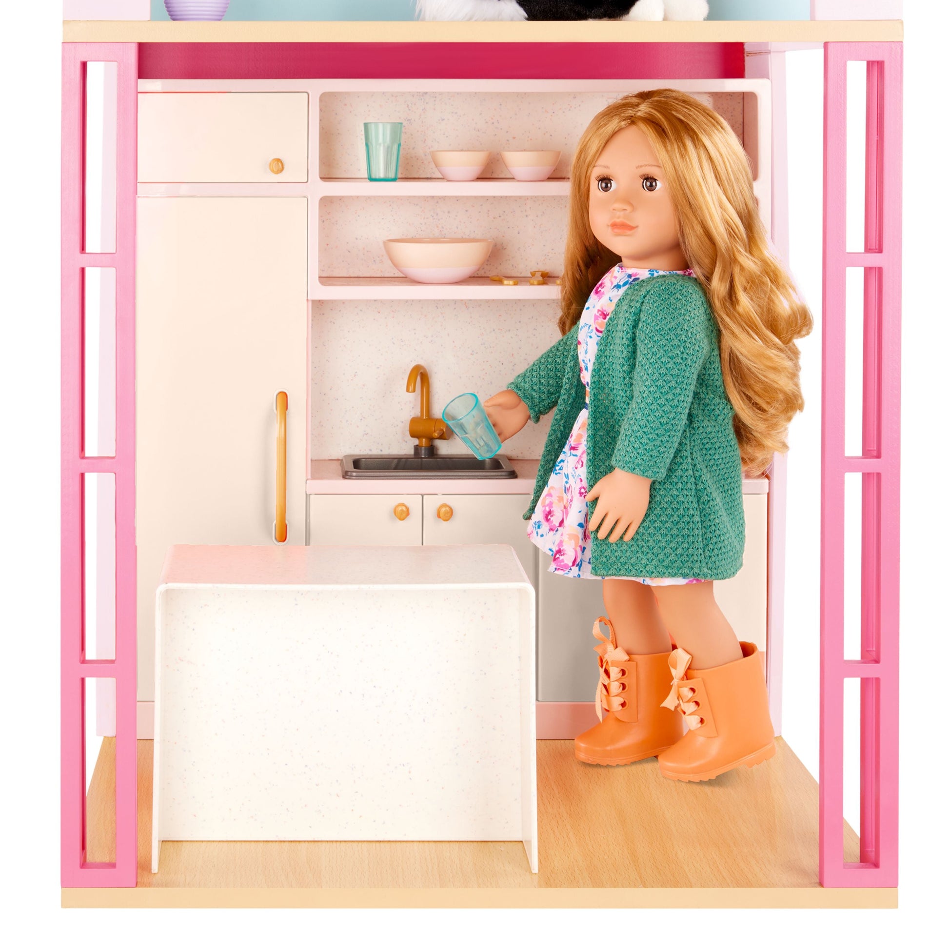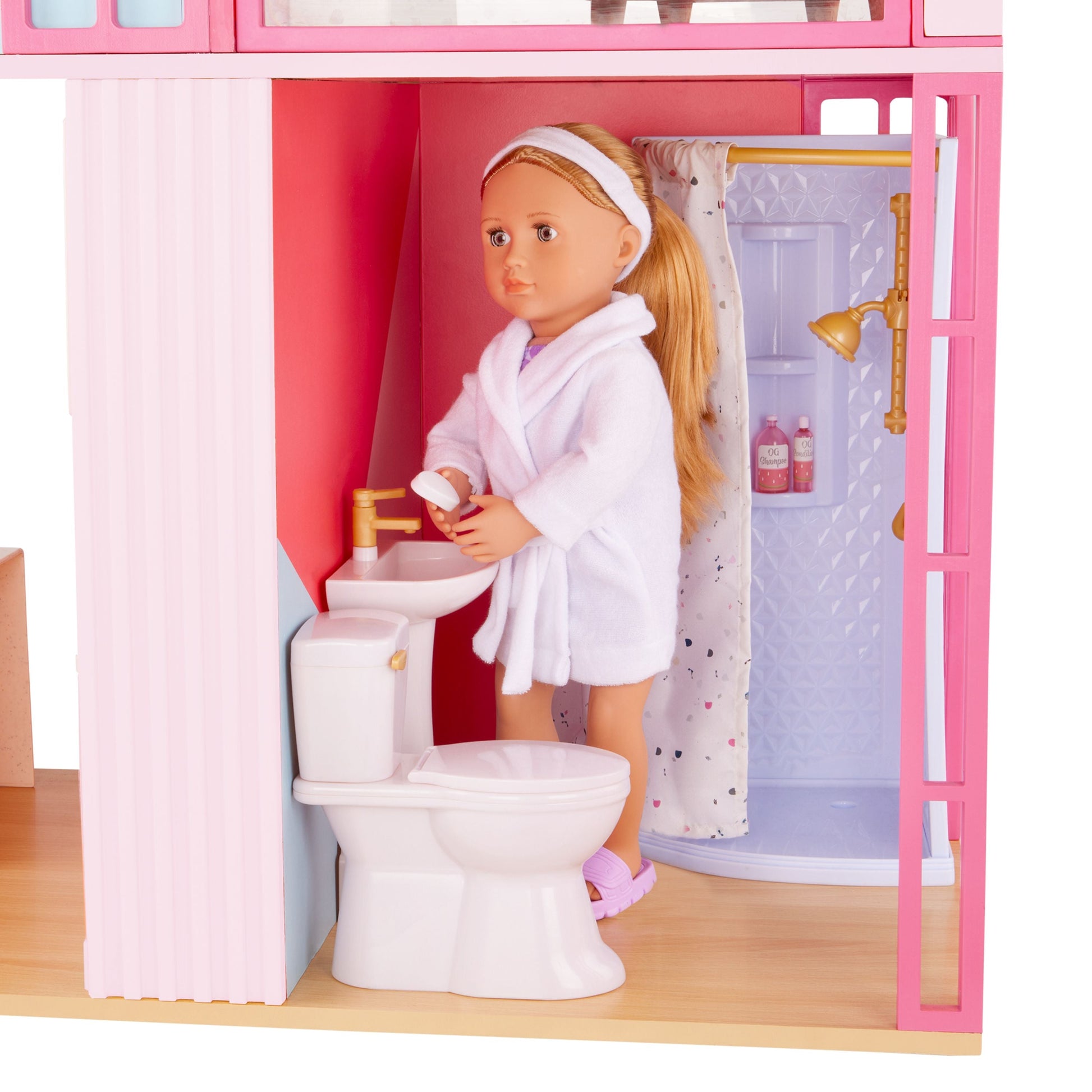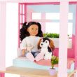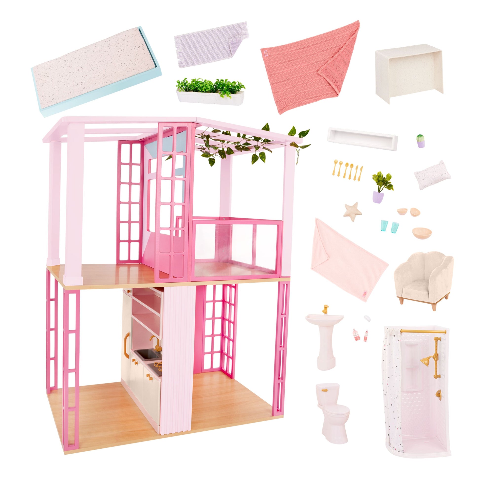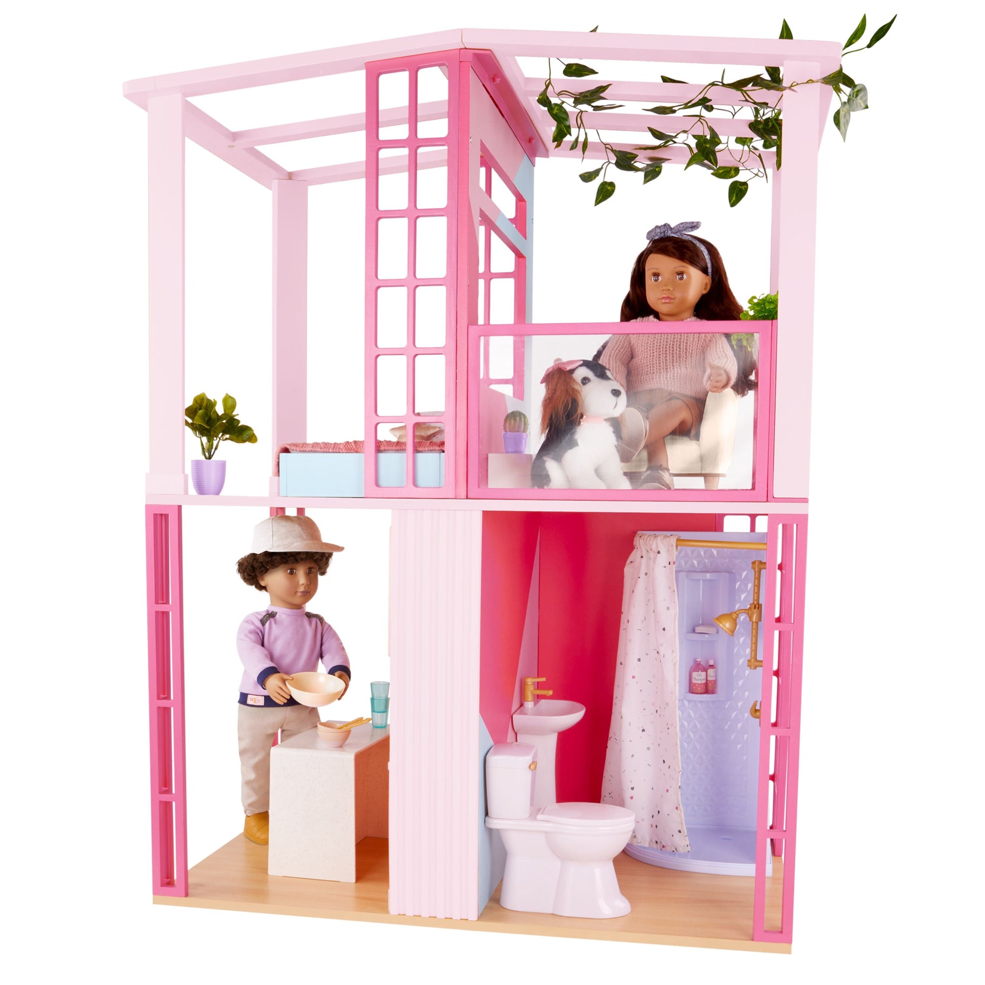 The Our Generation Lovely Loft dollhouse lets kids explore endless hours of playtime with their favorite 18-inch dolls! Standing over 3 feet tall, this charming dollhouse is designed in sweet shades of pink and features 4 spacious rooms with 30+ accessories to fully decorate each space. Plus, it even comes with a toilet that makes a fun flushing sound as kids press the handle! The open design allows kids to easily access each room to bring fun-filled stories to life – from the bedroom and bathroom to the kitchen and built-in terrace. It's also made with real wood parts to create a sturdy and durable dollhouse for even the most active play sessions. The Our Generation Lovely Loft dollhouse requires adult assembly and includes easy-to-follow, step-by-step instructions so your dolls can prep for moving day in no time! Makes a wonderful gift for kids ages 3+ (small parts), encouraging them to create their own unique stories in the perfect play area. Our Generation dolls sold separately.