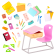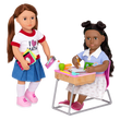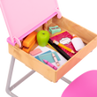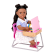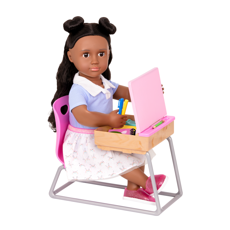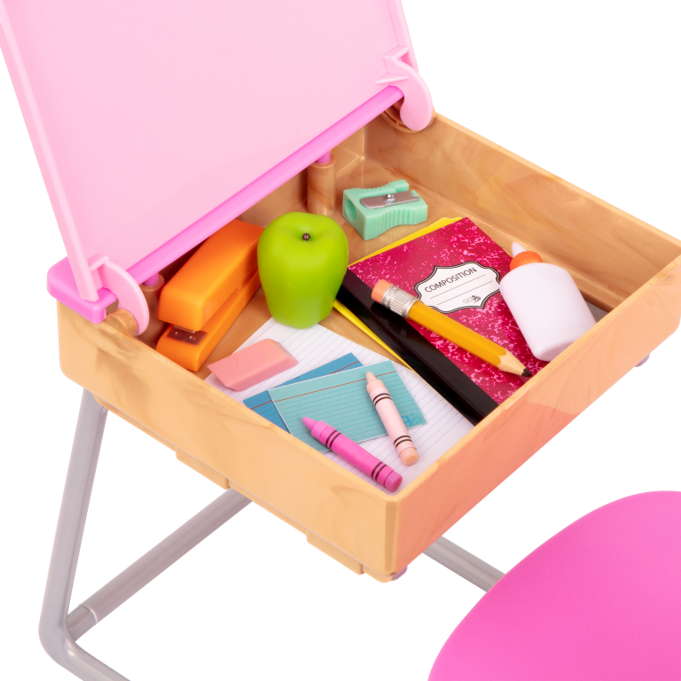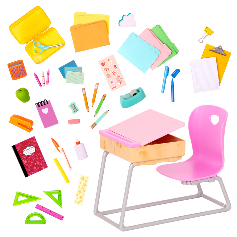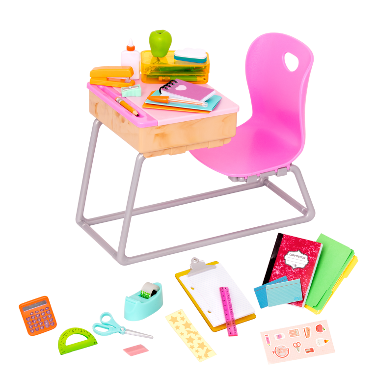 Attend class and learn your favorite subjects with the Our Generation Flying Colors school set for 18-inch dolls! Seat your dolls at the pretty pink desk and get ready for a day of classroom fun. Open up the desk front and grab the geometry set with the pretend calculator to solve the teacher’s equations during math class. Then sharpen your pencils and open up the notebook so your dolls can write down their short stories – they can even keep a list of their bright ideas in the spiral notepad! Personalize your school desk by decorating it with the sticker sheet, and organize school projects with the 5 colored folders. The pretend stapler will keep your papers neatly tOur Generationether, and the sticky post-it notes really stick to create cute labels! Each accessory is perfectly sized to fit in your Our Generation doll’s hands, and the realistic details make school play extra engaging!