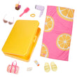 The Well Traveled Luggage Set by Our Generation is your passport to fun and adventure for 18-inch dolls! Let your doll be the perfect tourist with a rolling carry-on luggage full of travel essentials (with a cute cat name tag!) Your doll is ready to board with the mini boarding pass and passport. Let your doll doze on long flights with the cat-shaped travel pillow, and keep her entertained with snacks, a travel journal, a world map, and a pen. Toiletries, a camera, and a sheet of stickers for decorating the doll's suitcase round out this delightful travel accessory kit.