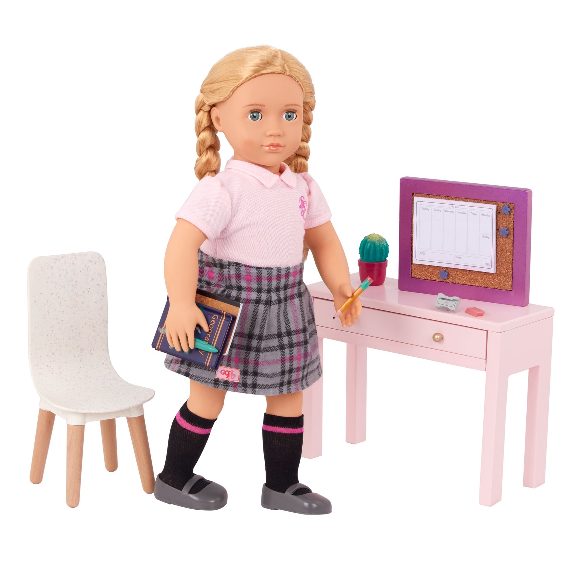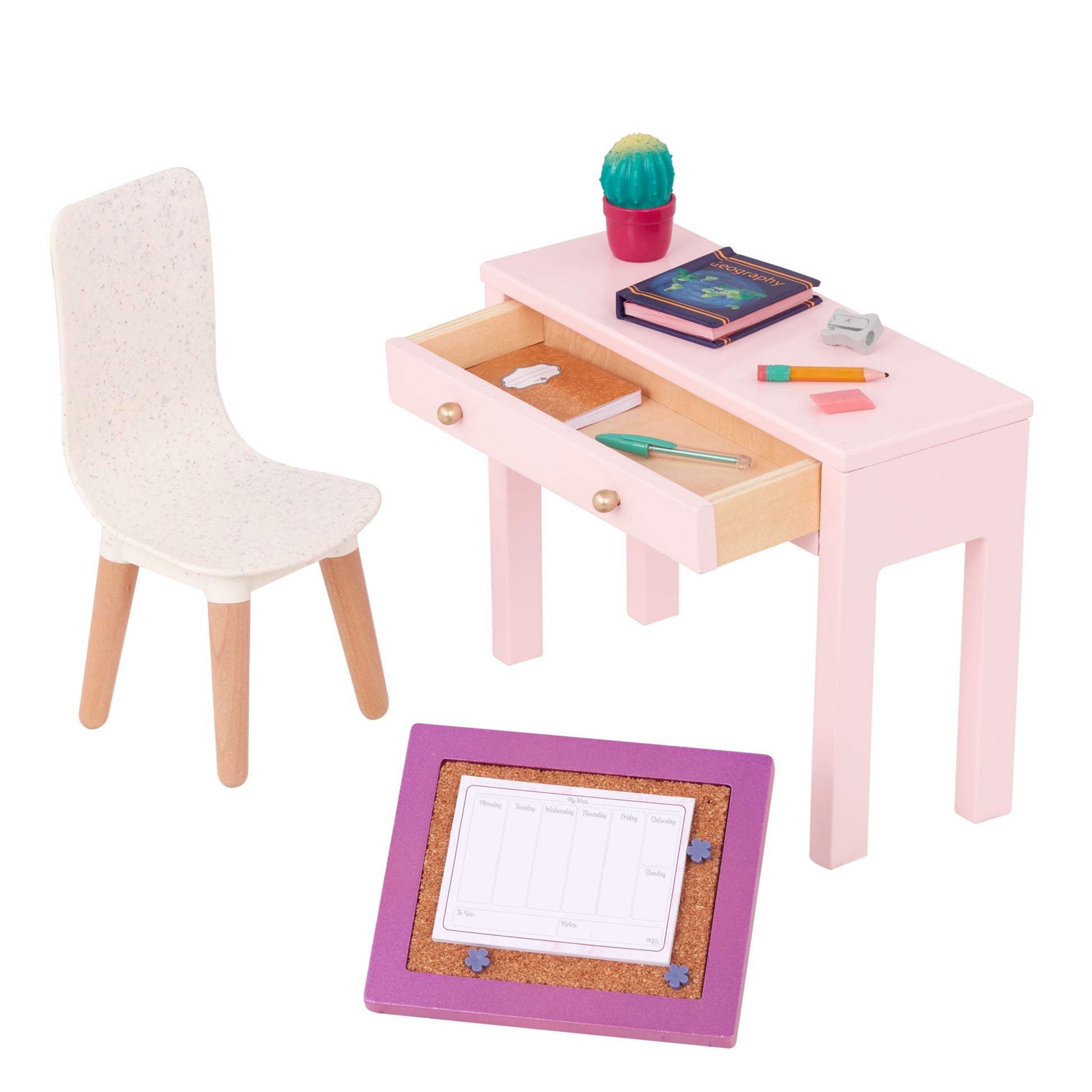 Design your 18-inch doll's workstation with modern decor from the Our Generation Working Wonder set! Perfect for dollhouses or on its own, arrange the furniture pieces to create your doll's dream space in your favorite play areas. Then redecorate for more stylish fun! The wooden desk has an opening drawer so your dolls can neatly store their accessories, like the notebook, textbook, pen, pencil, sharpener, and eraser. The weekly planner will help organize their essential tasks, and the real cork board with 3 safety push pins lets them hang notes, photos, and more! This complete home office furniture set is compatible with most 18-inch dolls and accessories. Dolls sold separately.
