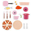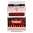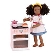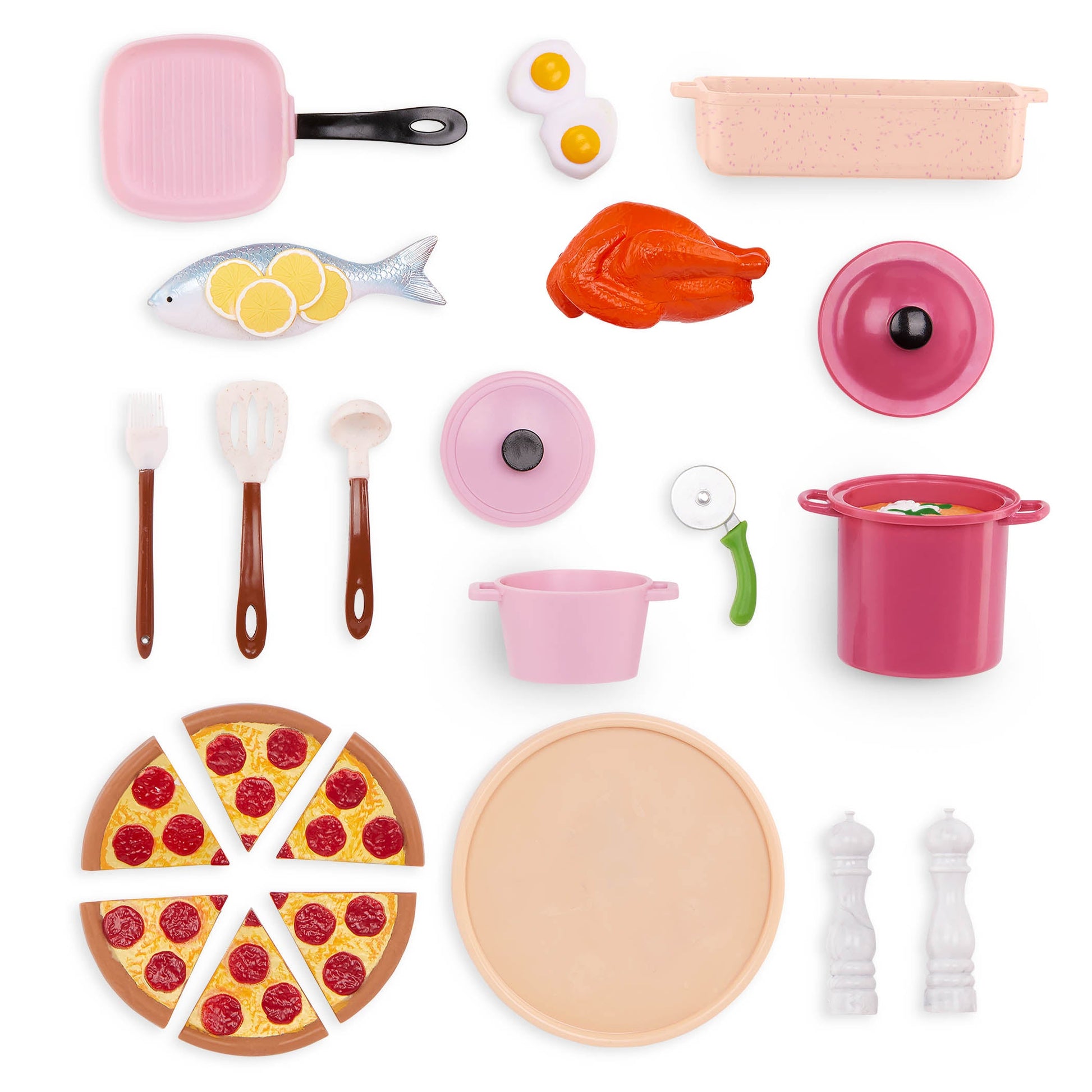 stove with light and sounds, 2 stove racks, 1 pizza tray, 6 slices of pizza, 1 pizza cutter, 1 roasting pan, 1 turkey, 1 basting brush, 1 pot of soup with lid, 1 soup ladle, 1 small pot with lid, 1 fish, 1 set of salt and pepper shakers, 1 frying pan, 1 slotted turner and 1 set of fried eggs. Dolls and outfits sold separately.