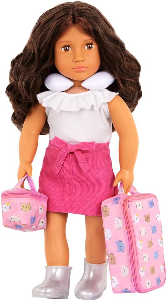 Travel the world in adorable style with the Our Generation Purrfectly Packed set for 18-inch dolls! Designed in cute kitty prints, the pink luggage and 2 carry bags zip open to pack and unpack the included travel essentials and toiletries. Plus, kids will love getting their dolls ready with the neck pillow, travel cup, and pretend music player! Themed accessories like the passport and boarding pass add to the storytelling and let little explorers journey anywhere their dreams will take them. Our Generation fans are going places! The Our Generation Purrfectly Packed set makes a great gift for kids ages 3 years old and up (small parts), encouraging them to imagine their own unique stories. Compatible with most 18-inch dolls and accessories. Our Generation dolls sold separately.