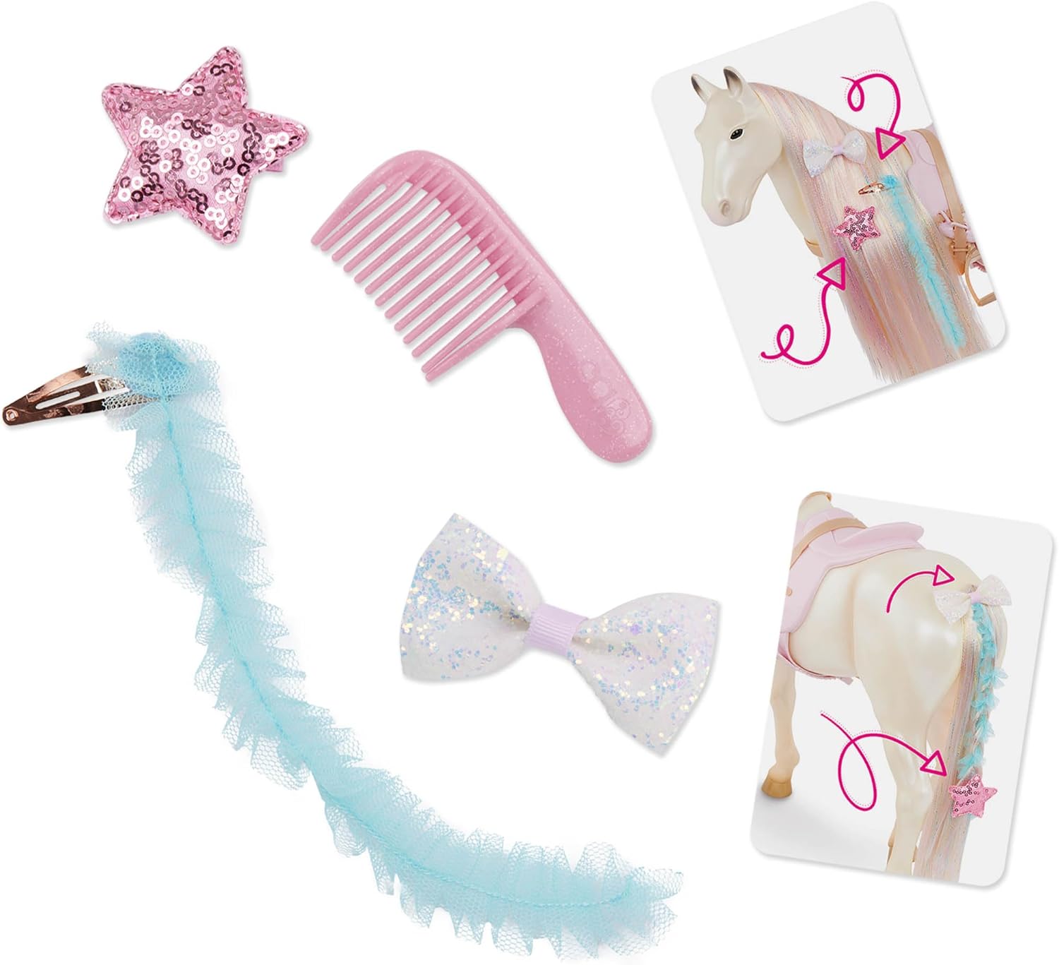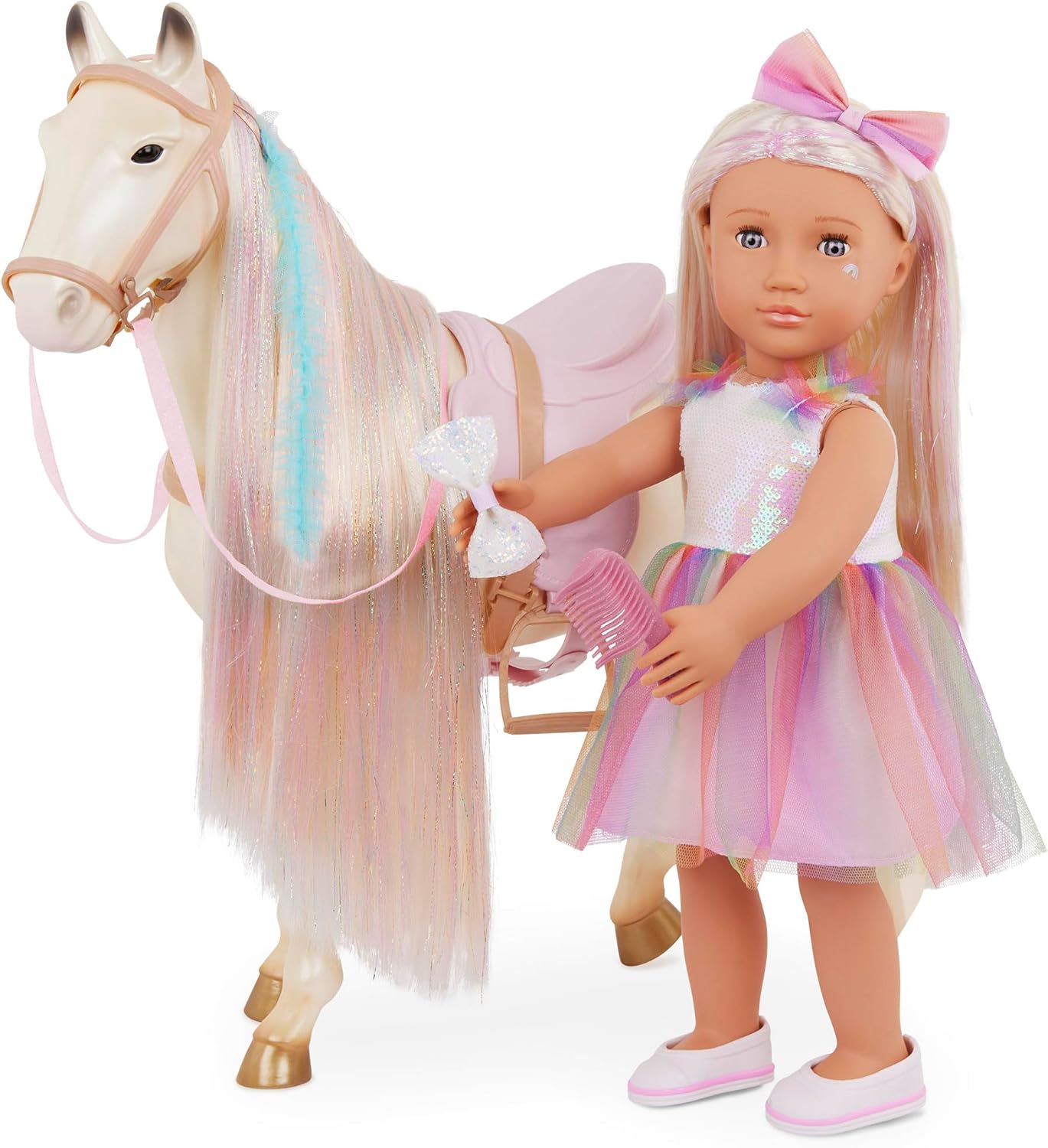 Run wild with magical looks! Kids who love playing with hairstyles will have a style stampede with the Our Generation Enchanting Horse. This charming 51cm toy horse is the perfect size for 46cm dolls to ride, and it comes with lots of styling accessories for hours of hair play fun. The Enchanting Horse's ultra-long mane and tail are filled with cute rainbow tinsels to shine on every horseback riding adventure. Plus, the 2 hair clips and bright blue hair tassel let kids decorate the horse from mane to tail for extra dazzle! Once your horse has a perfect look, seat your doll on the bright pink saddle and blaze new trails together! The Our Generation Enchanting Horse is a great gift for kids ages 3+ (small parts), encouraging them to create their own unique stories. Compatible with most 46cm dolls and accessories. Dolls sold separately.