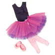 This lovely ballet outfit for 18-inch dolls works for all kinds of dance, and can even be mixed and matched with other outfits for an endless collection of pretty doll clothes. Start with the pale-pink tights and ballet flats, then layer the black ballet leotard over top. Finish off your beautiful ballet look with the tulle tutu skirt. It has a rainbow of pink, purple, and blue layers and a sweet bow on the waistband. Your dolls will be ready to arabesque all day!
