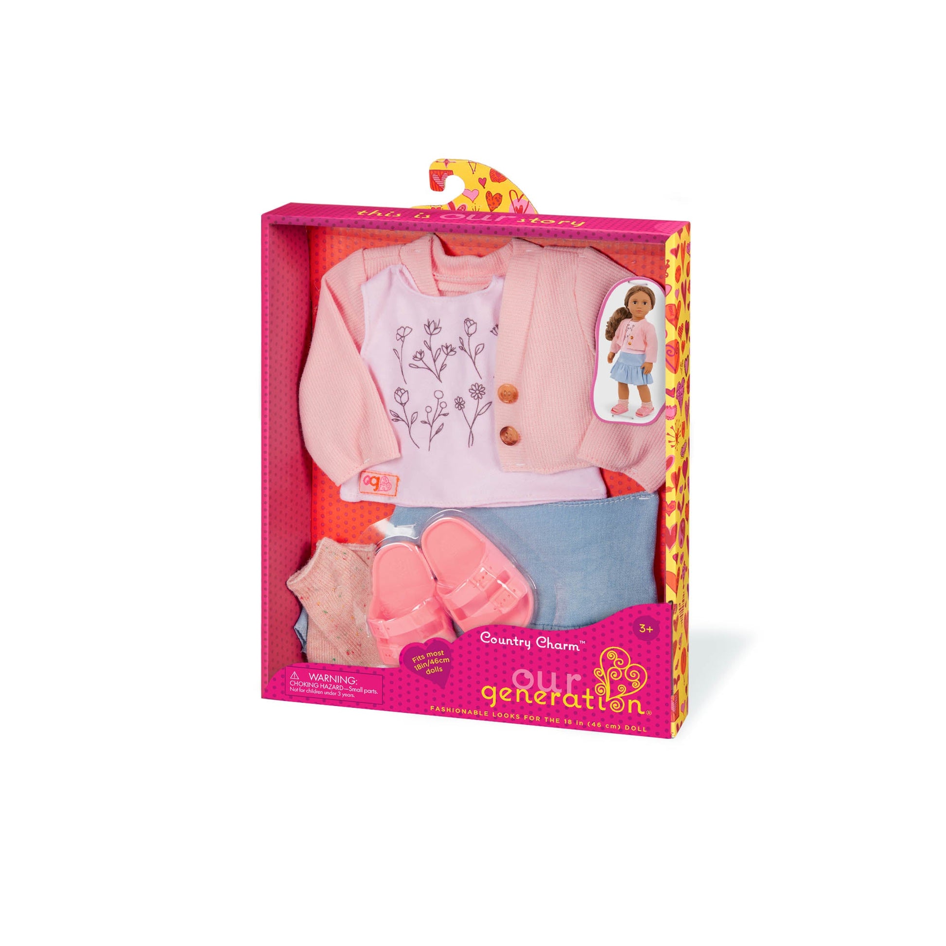 Explore sweet and stylish fashion with the Our Generation Country Charm outfit! This 18-inch doll clothing set will have your favorite doll ready to shine on every out-and-about adventure. It includes a cute floral-print top, a bright pink button-up sweater, a pleated blue skirt, socks, and sandals for a complete look. When it’s time for dress-up, this 18-inch doll outfit has easy-open closures to quickly put on and remove. So kids can mix, match, and create more stylish looks as they explore imagination and self-expression. Our Generation 18-inch doll clothes make a great gift for kids ages 3+ (small parts), encouraging them to create their own unique stories. Compatible with most 18-inch dolls, doll clothes, and accessories. Dolls sold separately.
