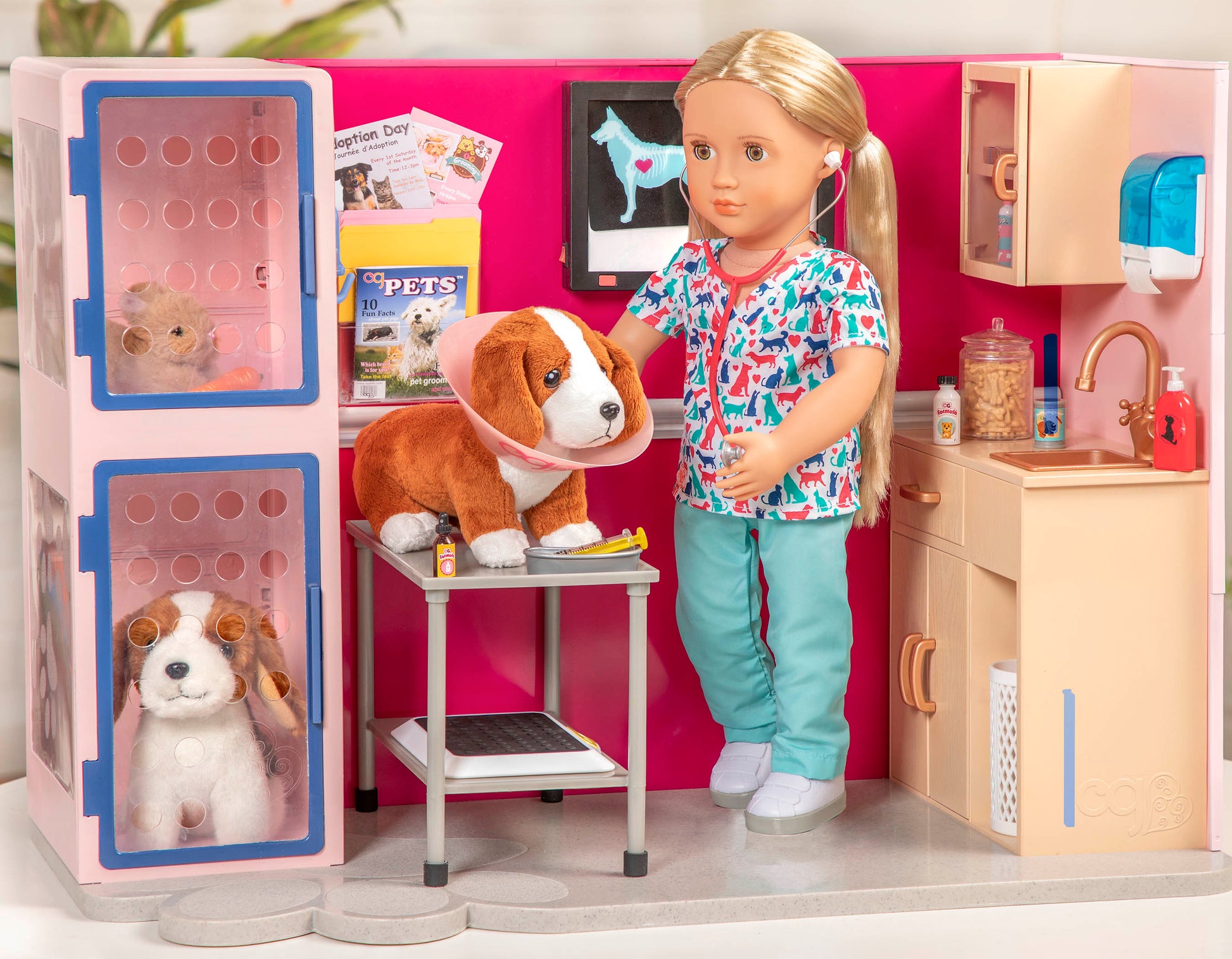 Give comfort and care to pets everywhere with the Our Generation Healthy Paws veterinarian outfit for 18-inch dolls! With the right tools and a lot of love, your dolls will be able to make their furry friends all better. Dress your doll in the veterinarian uniform (called "scrubs"), a short-sleeved shirt with colorful animal prints and a pair of green pants with a waist tie. Vets need to be on their feet a lot during a day at the clinic, so help your doll stay comfortable in the comfy vet shoes. When it's time to give your pet pals a check-up, use the stethoscope to listen to their heartbeat and the otoscope to check their ears – it really lights up! Then use the veterinarian's notepad and pen to record any symptoms or prescribe treatments! (Dolls, pets, and vet clinic sold separately)