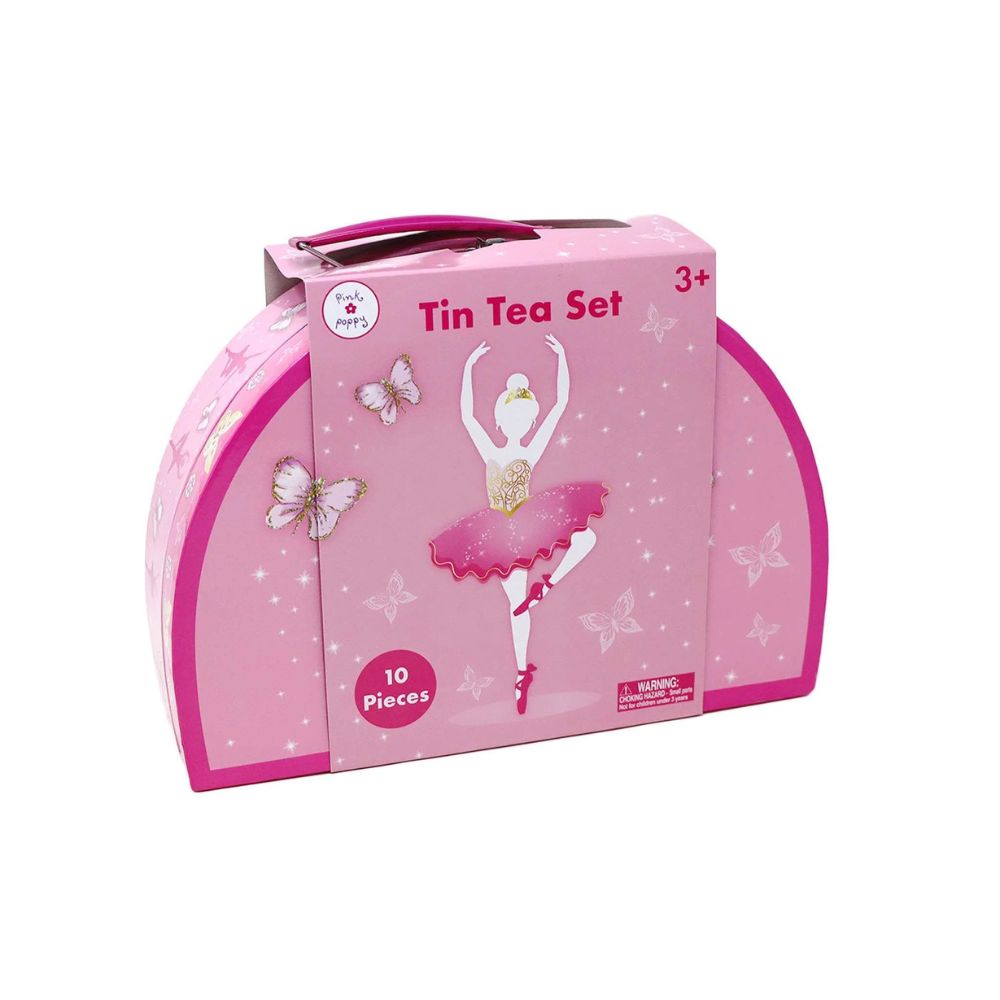Pink Poppy's Butterfly Ballet Tin Tea Set. Inspired by the Butterfly Ballet, this tin tea set comes with everything your little one needs to host a tea party for 2. Includes 9 pieces made from lightweight tin which is safe for clumsy little hands. Stored in a beautiful matching carry case. Ideal for creative & imaginative play indoors & outdoors.