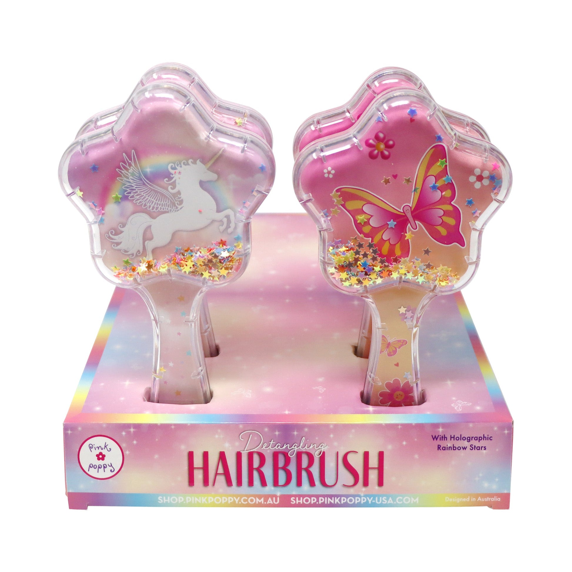 Pink Poppys Unicorn & Vibrant Vacation Holographic Glitter Hairbrush makes your daily beauty routine more fun and magical. The transparent star-shaped hairbrush has a beautiful illustration of beloved Rainbow Unicorn and Vibrant Butterfly, fun shakeable sparkly star sequins swish as you brush. Great gift for little girls.