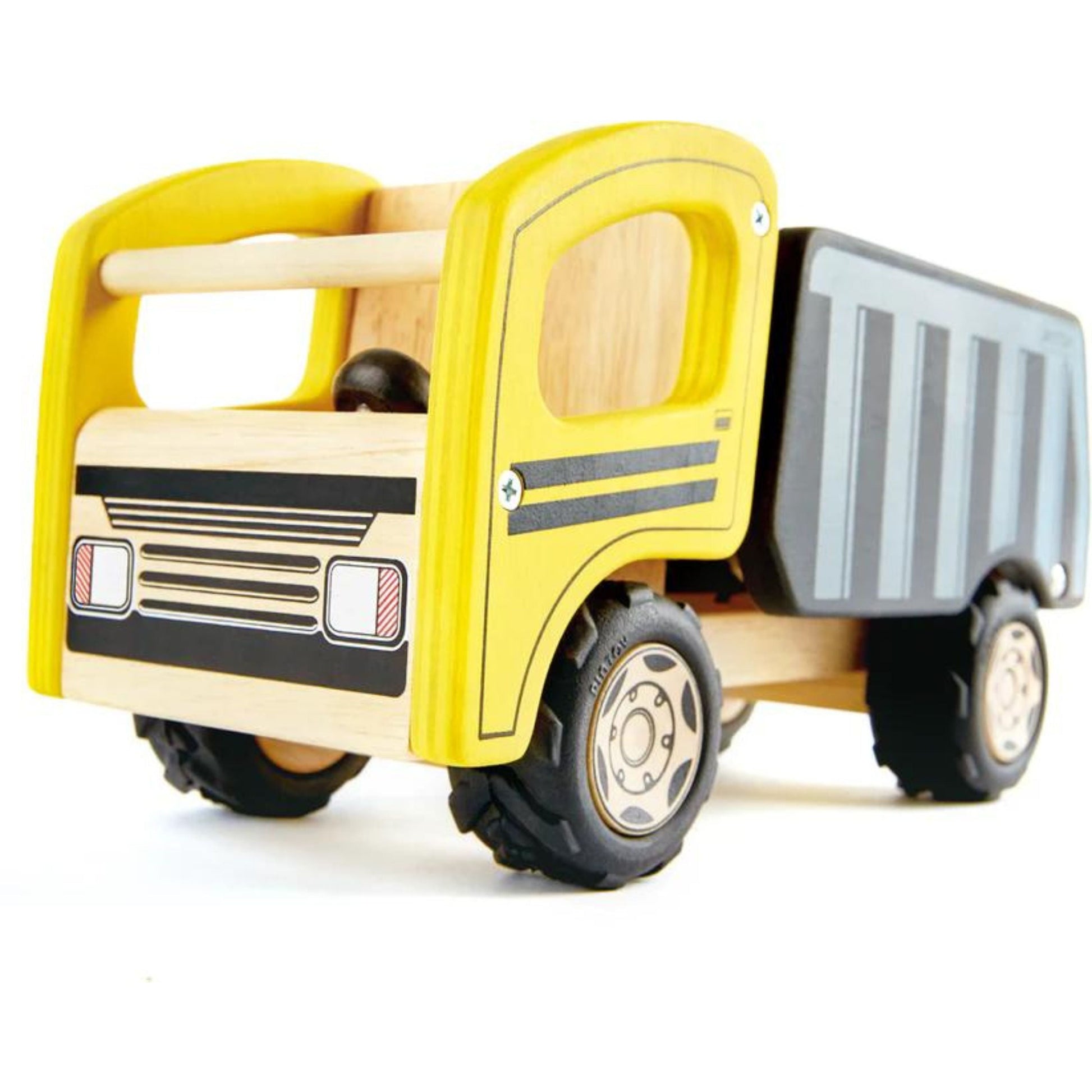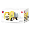 great wooden dumper truck with Pintoy logo. The cab is painted yellow with black detailing and the tipper half is a realistic black and grey design. The tipper actually moves up and the tailgate opens to get rid of all the stuff ready to be dumped – very realistic.