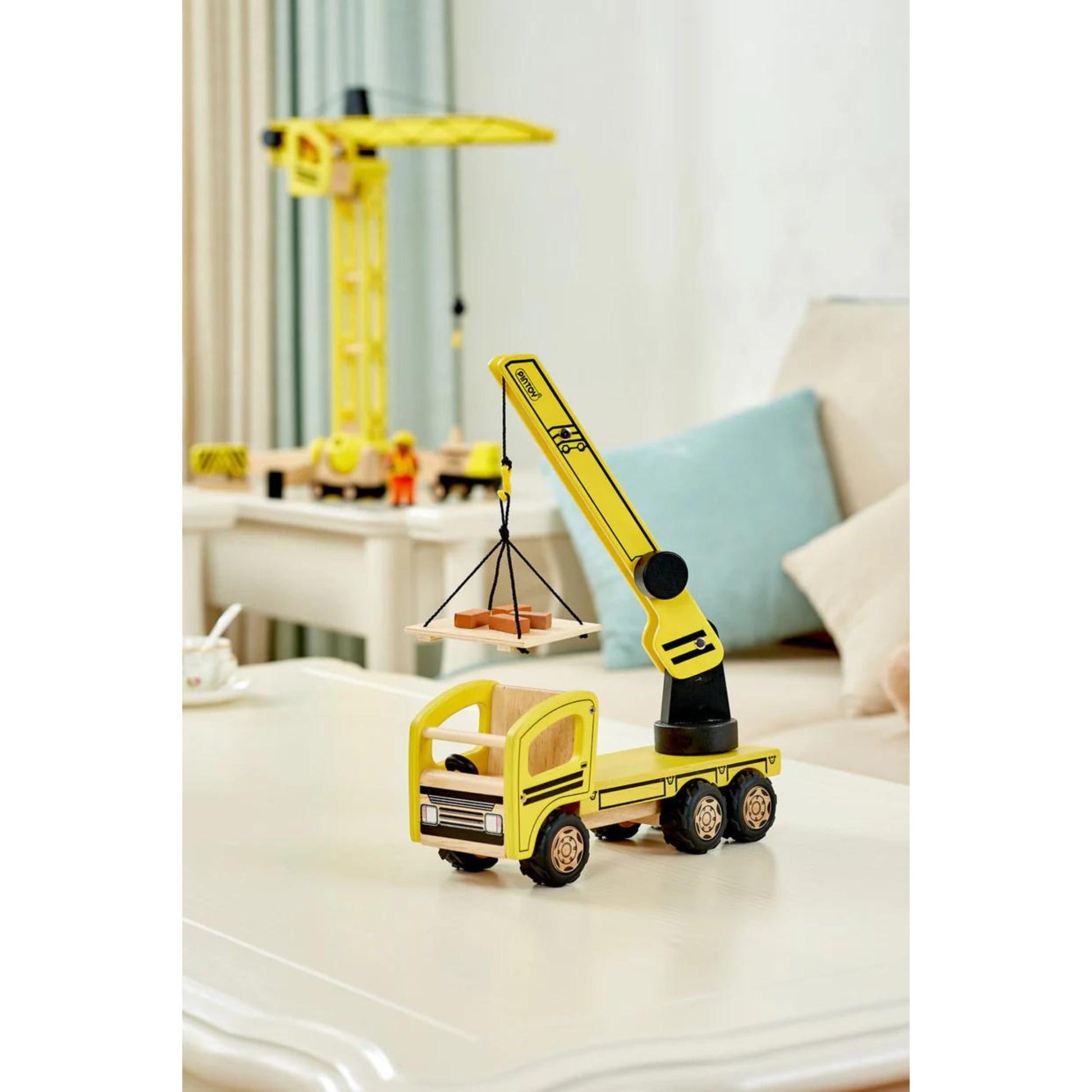 The Pintoy Construction Crane is very functional with a rotating boom and hook which moves up and down giving your little construction worker full control.