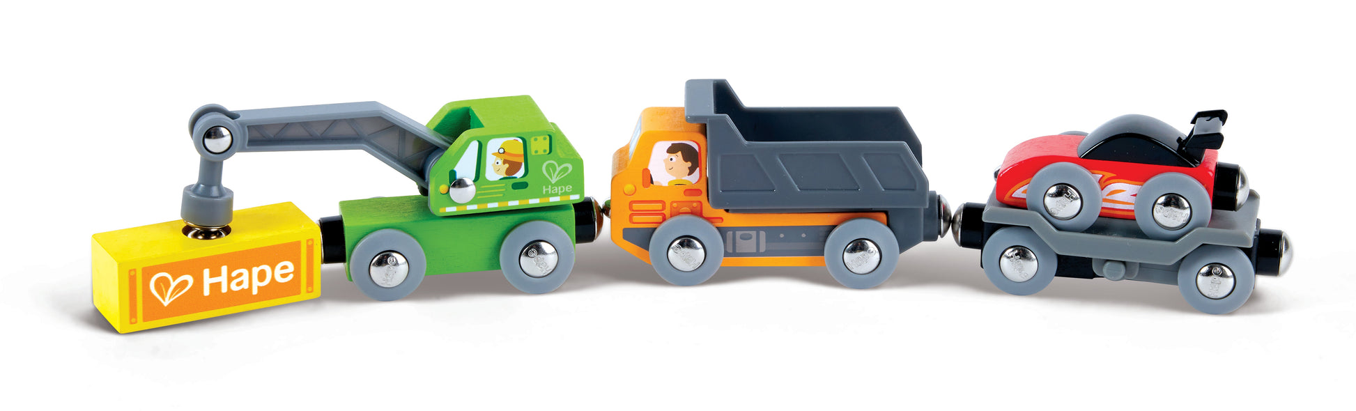 Discover construction fun with our fleet—crane, dump truck, and trailer carrying a cool red racing car. Perfect for little learners exploring the world of vehicles!