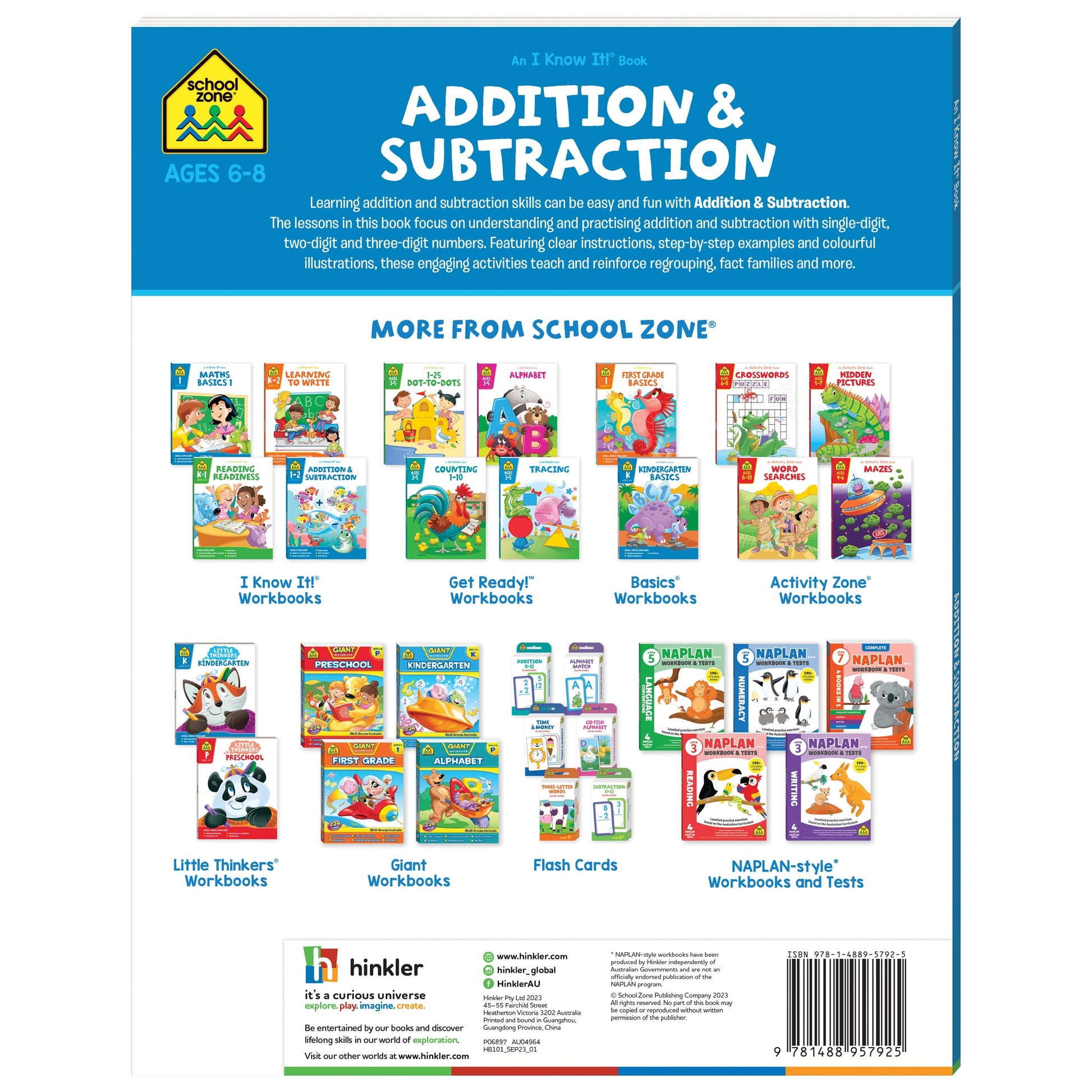 This School Zone Addition & Subtraction workbook helps kids aged 6 to 8 with their addition and subtraction skills, and keeps learning easy and fun. The lessons in this book focus on understanding and practising addition and subtraction with single-digit, two-digit and three-digit numbers.