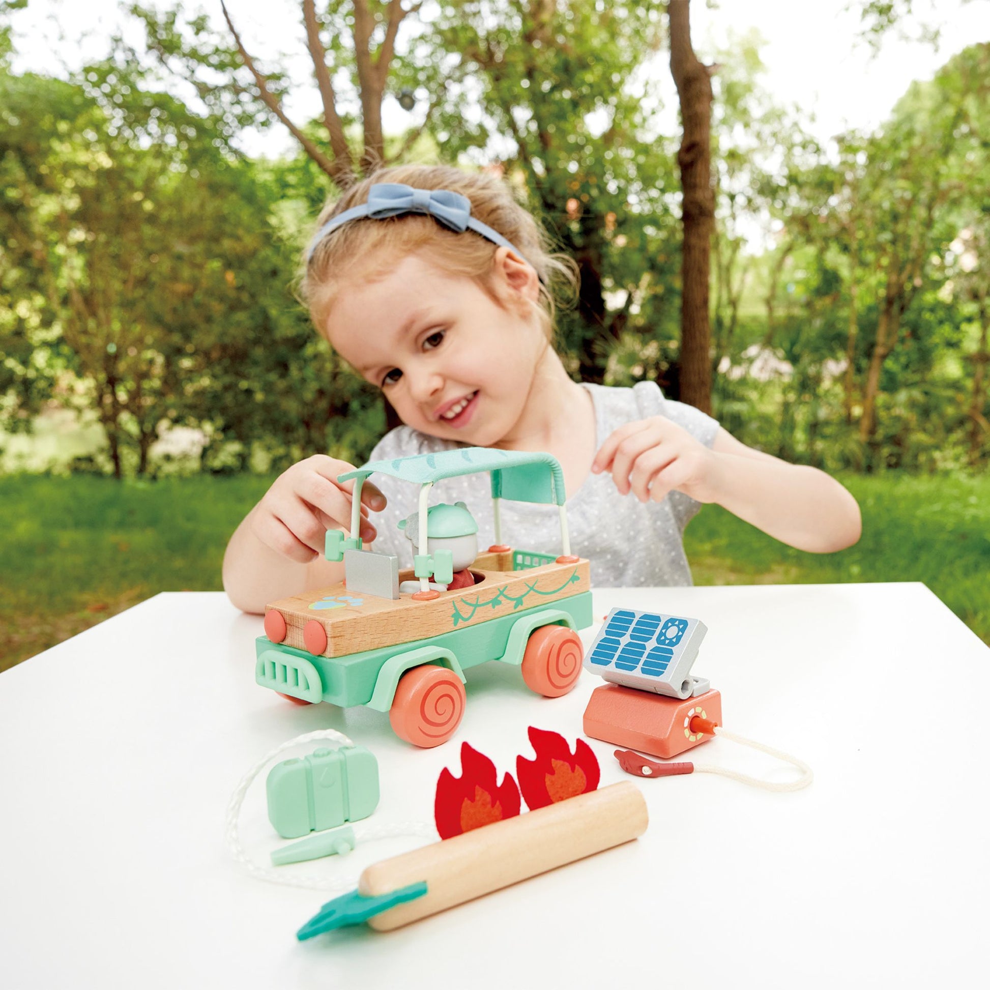 PLENTY OF ACCESSORIES: This set includes one off-road car, one koala figurine, one hat, one vest, one fallen tree, one hook, one water tank, two felt flames, one portable solar charger, one tablet and one leaflet.