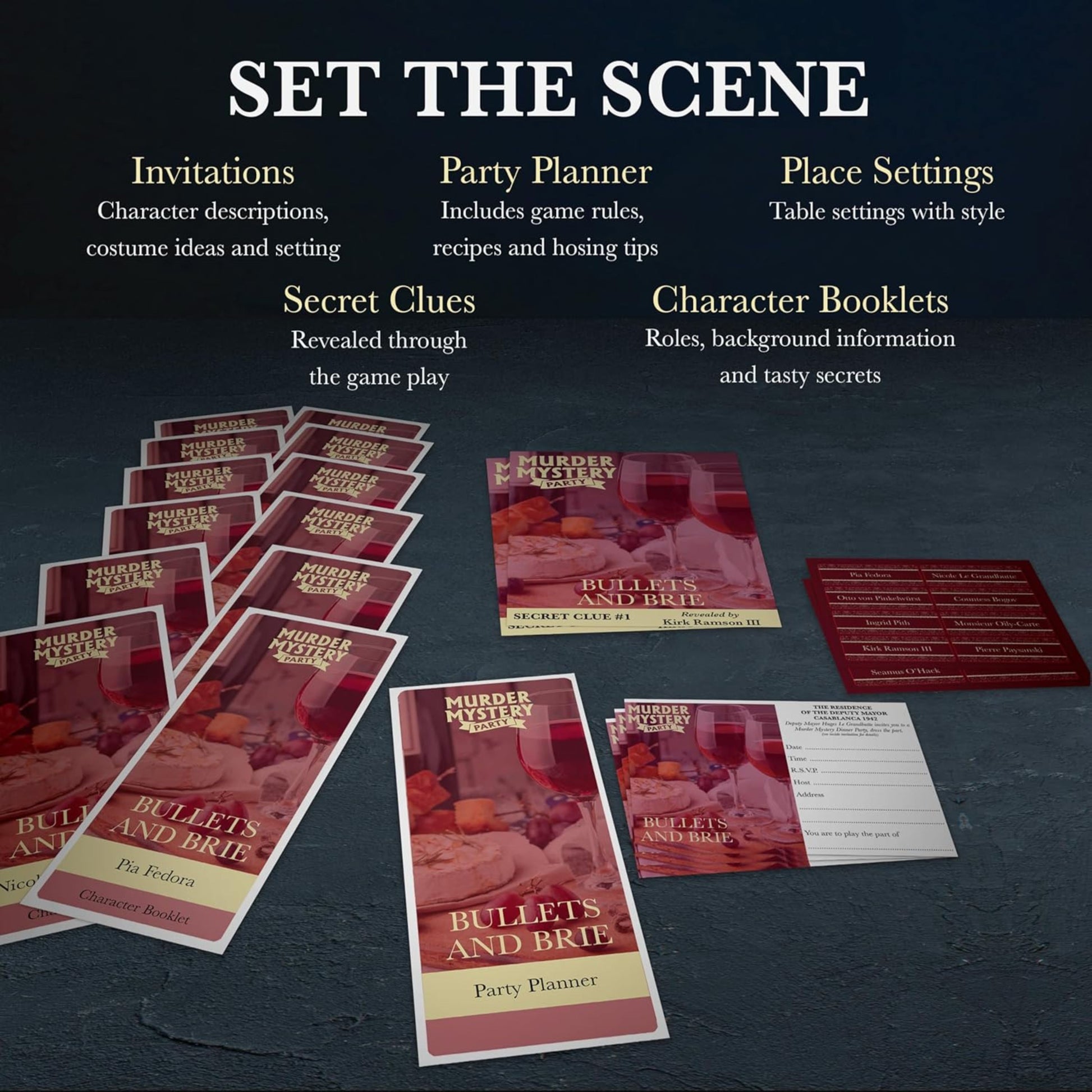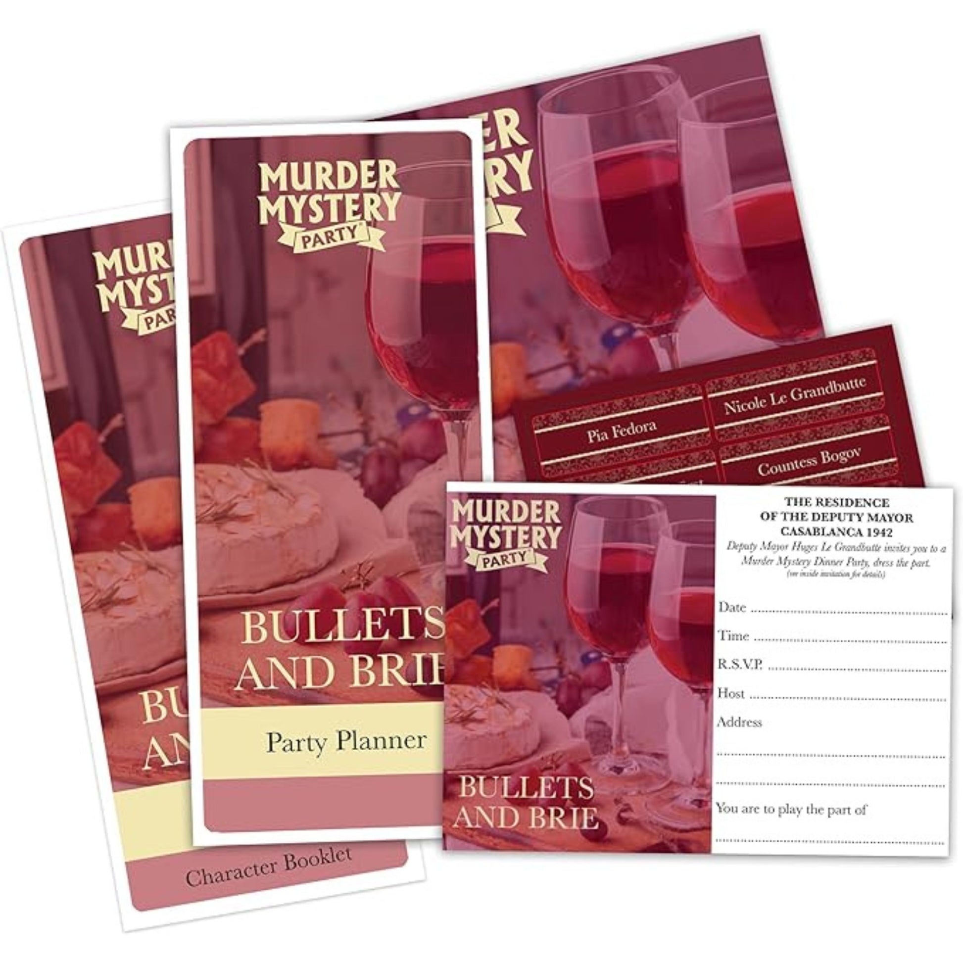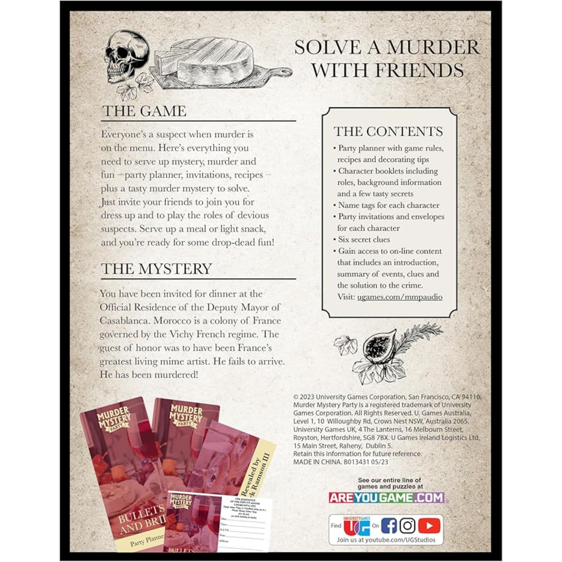 with a Classic Detective Murder Mystery you have everything you need to serve up the perfect murder mystery dinner party. First the invites, you choose which of your friends play which devious suspect and invite them to come along as that character. Then the shopping list, menu suggestions and recipes. Plus of course...a really tasty murder to solve. Brie Bullet and Black Cat is set in October 1942. You have been invited for dinner at the Official Residence of the Deputy Mayor of Casablanca.