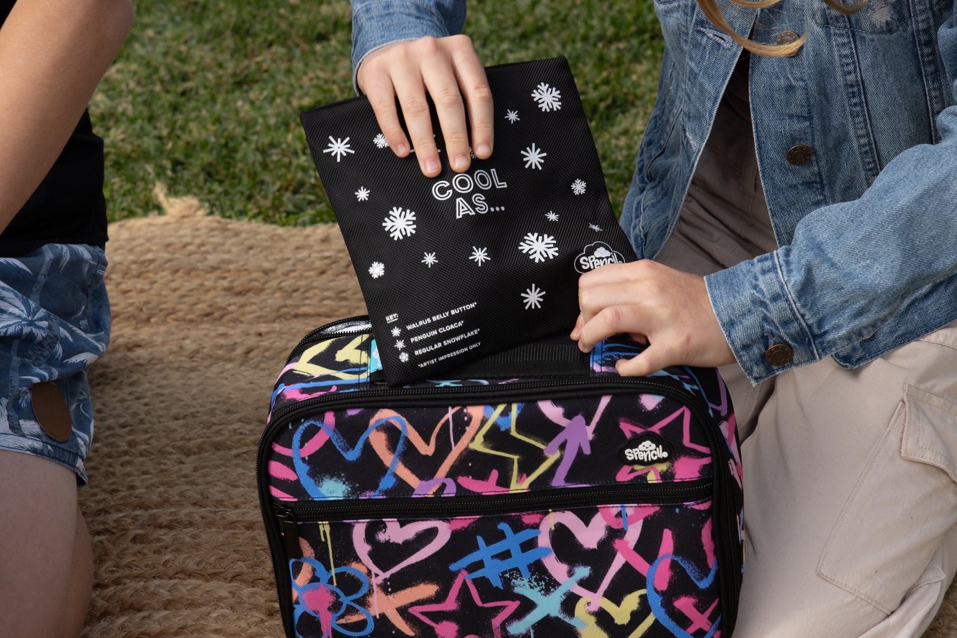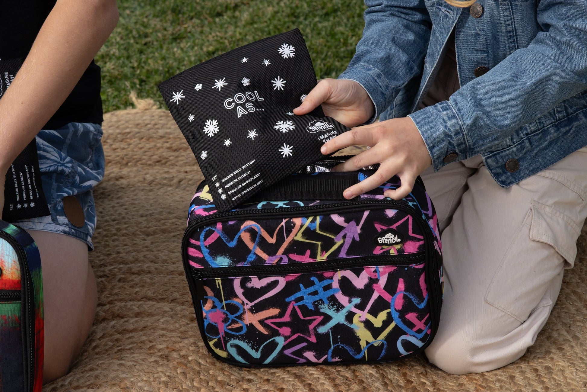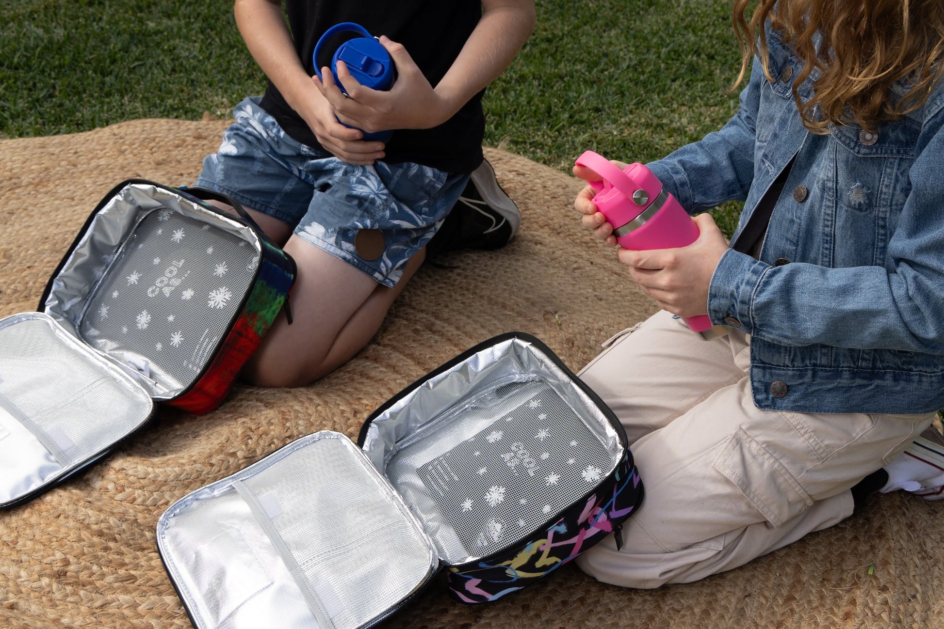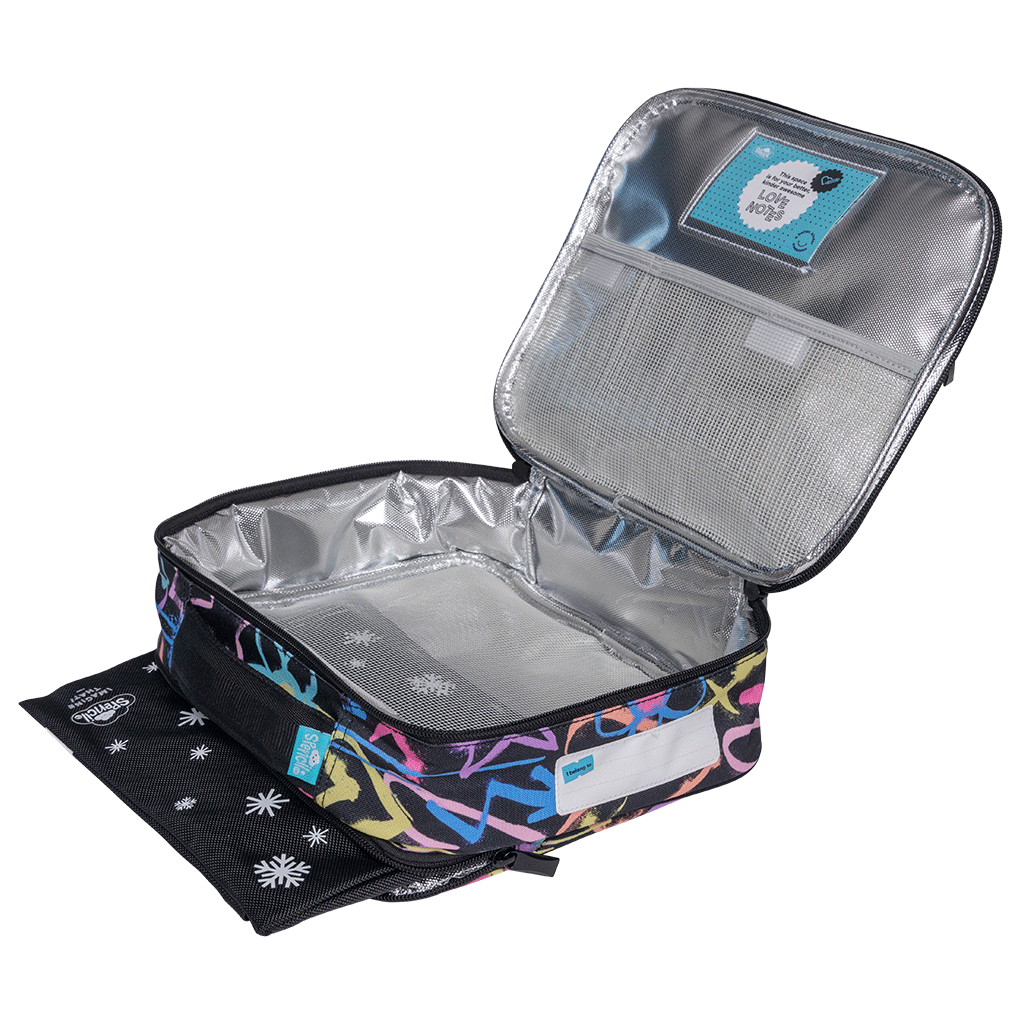 A new and improved design and even larger with an extra 1cm width, it's perfect for fitting the Spencil Big Bento Box and Big Chill Pack! Keep your kid's food fresh (and fun!) with this lunch bag designed for primary and tween kids! The Big Cooler Lunch Bag is the ideal bigger size, perfect for fitting the Big Chill Pack and either the Spencil Big Bento Box or Little Bento Box - with extra room for fruit or small containers! With aluminium food-safe silver lining, a back zip pocket that perfectly fits the Big Chill Pack, outside name card pocket and an additional inside pocket for 'Love Notes' this is your go-to lunch bag for school and play! KEY FEATURES Machine washable Aluminium food-safe insulated lining to keep contents fresher for longer Front zip pocket Dual zip main compartment - easy to open and close Back zip pocket that perfectly fits the Big Chill Pack (sold separately) Thick, padded handle Outside clear name card pocket Inside pocket for 'Love Notes' (your own or ours - sold separately) 2-compartment mesh pocket inside lid with velcro seal for extra storage Made with long-lasting durable fabrics - PVC coated polyester Fits both the Spencil Big Bento Box and Little Bento Box (sold separately) Weight: Approx. 230 grams CARE INSTRUCTIONS Wipe with a damp cloth between uses to keep fresh Leave open on a drying rack or line overnight to dry out completely Machine washable - separately on a cold, delicate cycle Use regular detergent Don't forget to remove the name and note card Dry in the sun, with print facing upward Don't use fabric softener, stain remover or bleach Not suitable for tumble dryer or iron Optional: for extra TLC on the metal zippers you can also use a wash bag or pillow case