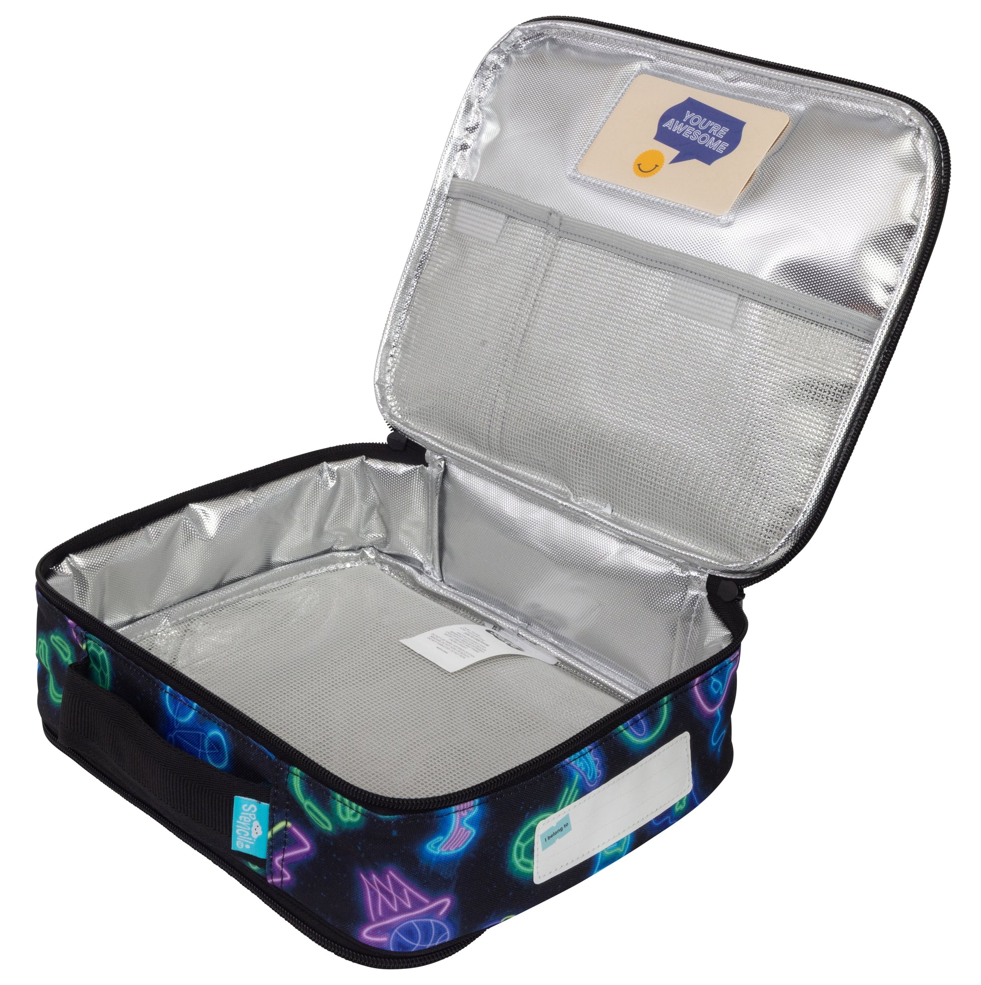Get ready to glow with Neon Life! This design is packed with all the bright, buzzing energy kids love—think electric vibes and pops of colour that make every day feel like a party. Perfect for standing out, for both little and big kids! A new and improved design and even larger with an extra 1cm width, it's perfect for fitting the Spencil Big Bento Box and Big Chill Pack! Keep your kid's food fresh (and fun!) with this lunch bag designed for primary and tween kids! The Big Cooler Lunch Bag is the ideal bigger size, perfect for fitting the Big Chill Pack and either the Spencil Big Bento Box or Little Bento Box - with extra room for fruit or small containers! With aluminium food-safe silver lining, a back zip pocket that perfectly fits the Big Chill Pack, outside name card pocket and an additional inside pocket for 'Love Notes' this is your go-to lunch bag for school and play! KEY FEATURES Machine washable Aluminium food-safe insulated lining to keep contents fresher for longer Front zip pocket Dual zip main compartment - easy to open and close Back zip pocket that perfectly fits the Big Chill Pack (sold separately) Thick, padded handle Outside clear name card pocket Inside pocket for 'Love Notes' (your own or ours - sold separately) 2-compartment mesh pocket inside lid with velcro seal for extra storage Made with long-lasting durable fabrics - PVC coated polyester Fits both the Spencil Big Bento Box and Little Bento Box (sold separately) Weight: Approx. 230 grams CARE INSTRUCTIONS Wipe with a damp cloth between uses to keep fresh Leave open on a drying rack or line overnight to dry out completely Machine washable - separately on a cold, delicate cycle Use regular detergent Don't forget to remove the name and note card Dry in the sun, with print facing upward Don't use fabric softener, stain remover or bleach Not suitable for tumble dryer or iron Optional: for extra TLC on the metal zippers you can also use a wash bag or pillow case