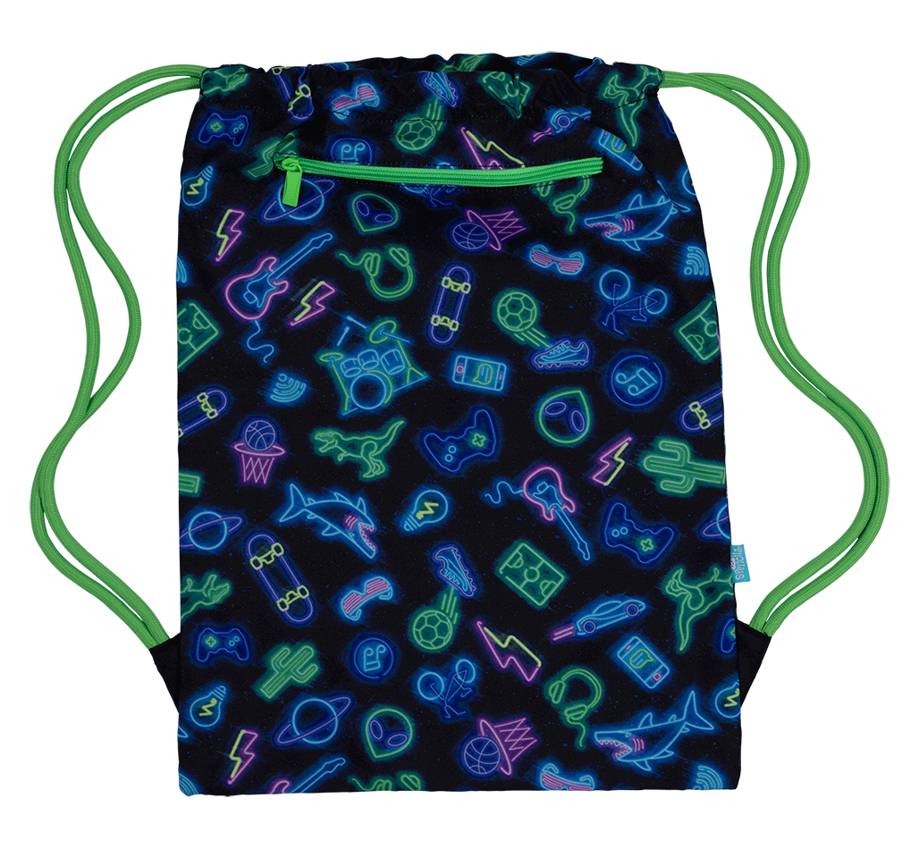 "Get ready to glow with Neon Life! This design is packed with all the bright, buzzing energy kids love—think electric vibes and pops of colour that make every day feel like a party. Perfect for standing out, for both little and big kids! The go-anywhere, carry-all, multi-purpose bag that has any occasion covered! Designed for primary and tween kids, the Big Drawstring Bag is made with water-resistant fabric, perfect for sport, swimming and adventures and has a convenient zipped pocket feature to safeguard wallets, passes, keys, and coins. The functional single pocket, drawstring design makes this bag quick and easy to pack, open and close KEY FEATURES