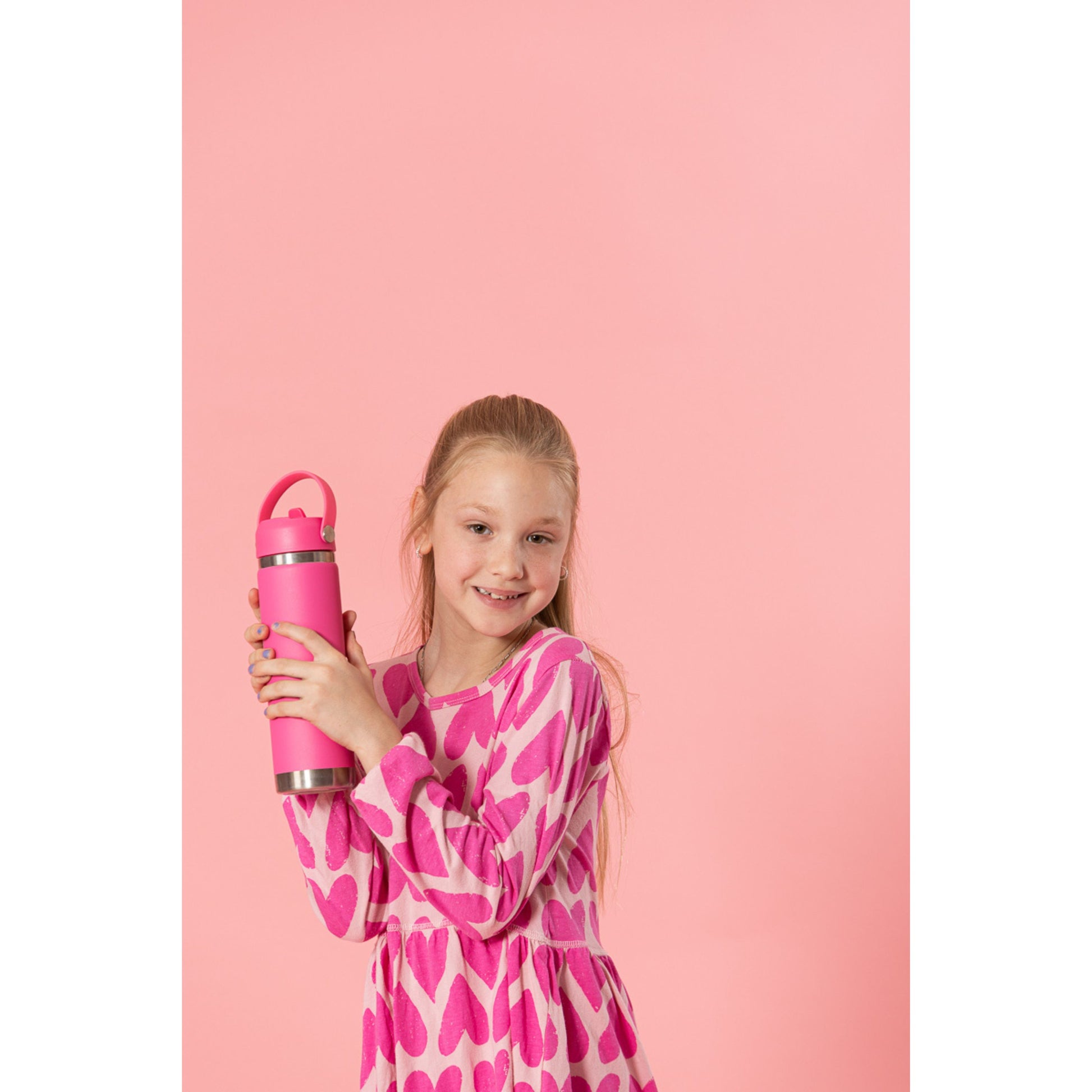 This insulated drink bottle is kid and Earth approved. Say goodbye to wasteful single-use plastic bottles and hello to eco-friendly sipping. First things first: safety. Our water bottle is PVC & BPA free, so no nasty chemicals will sneak their way into your kids sips. What about the chill factor? This awesome bottle keeps drinks frosty cold for a whopping 24 hours! We know because we've put it through rigorous testing, and it passed with flying colours. And when it comes to hot bevs, this bottle keeps them toasty for up to 8 hours. Accidents happen, but don't fret! This bottle is leak-proof so the kiddos can toss it in their backpack without worrying about soggy surprises. The spill-proof flip-up spout is a game-changer. Just flip, sip, repeat! We've swapped the original soft-spout lid for the hardier hard plastic spout made tough to take the rigours of even the most vigorous chewers! And the soft-feel handle makes it easy peasy to carry around wherever their little feet take them. We've included a removable stainless steel straw, for reusing and looking after the planet. And to keep that straw sparkly clean, there is a stainless steel cleaning brush too. KEY FEATURES PVC & BPA Free Dishwasher safe (no handwashing required here!) Leakproof Stays cold for 24 hours (we did the tests!) Stays hot for up to 8 hours (we also did the tests!) Tough powder colour coating Top and tail brush metal finish Soft-feel handle Spill-proof flip up spout Removable stainless steel straw Stainless steel cleaning brush 12 month manufacturer's warranty CARE Before first use, wash all parts in warm, soapy water, with a soft sponge Dishwasher safe (just be sure to handwash the silicone straw connector separately!) Place lid on the top shelf of dishwasher with spout open Can be filled with hot or warm water; do not fill with boiling water Take care before consumption of hot liquids to avoid scolding Carbonated beverages are not recommended Do not microwave After use, tighten cup cover and close pop-up straw to avoid spillage Always open pop-up straw away from the face and body Clear straw between uses with stainless steel cleaning brush MATERIALS Stainless steel body with polyester powder coating Polypropylene lid and sipper spout Thermoplastic rubber (TPR) handle Silicone lid seal and straw connector Stainless steel straw and cleaning brush PVC & BPA Free (meets EU and US export standards)