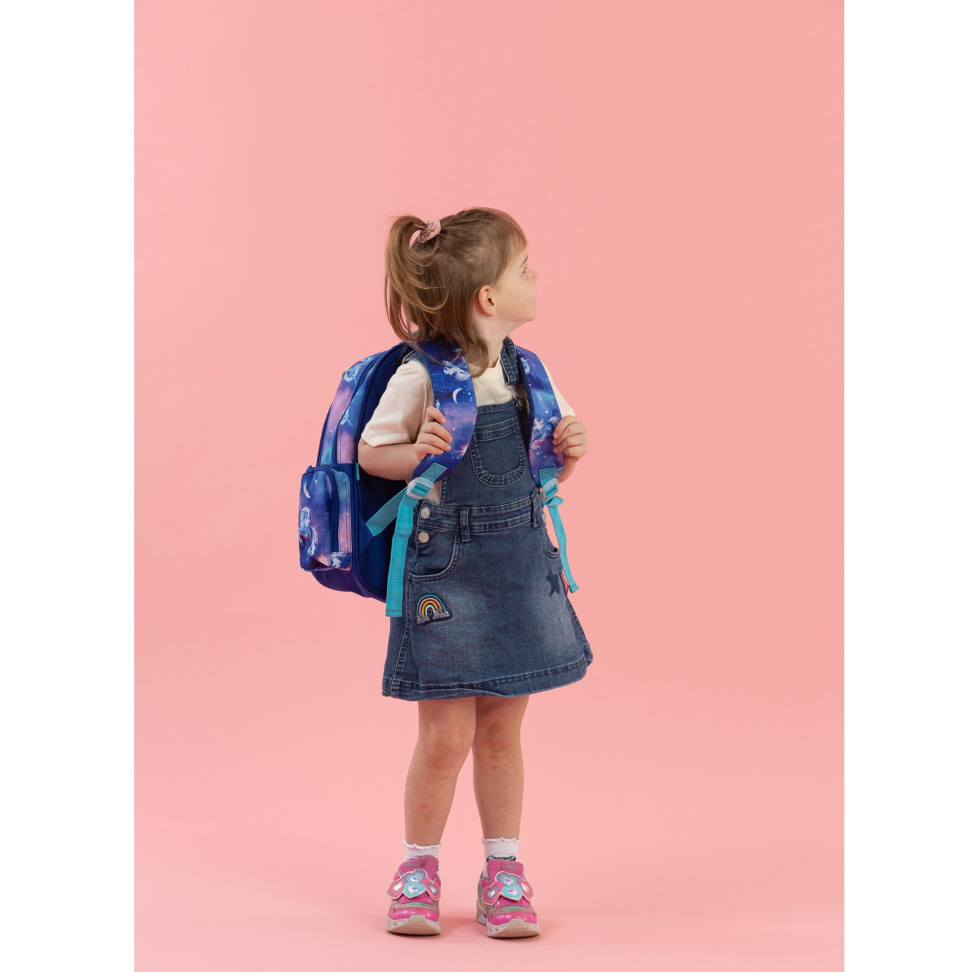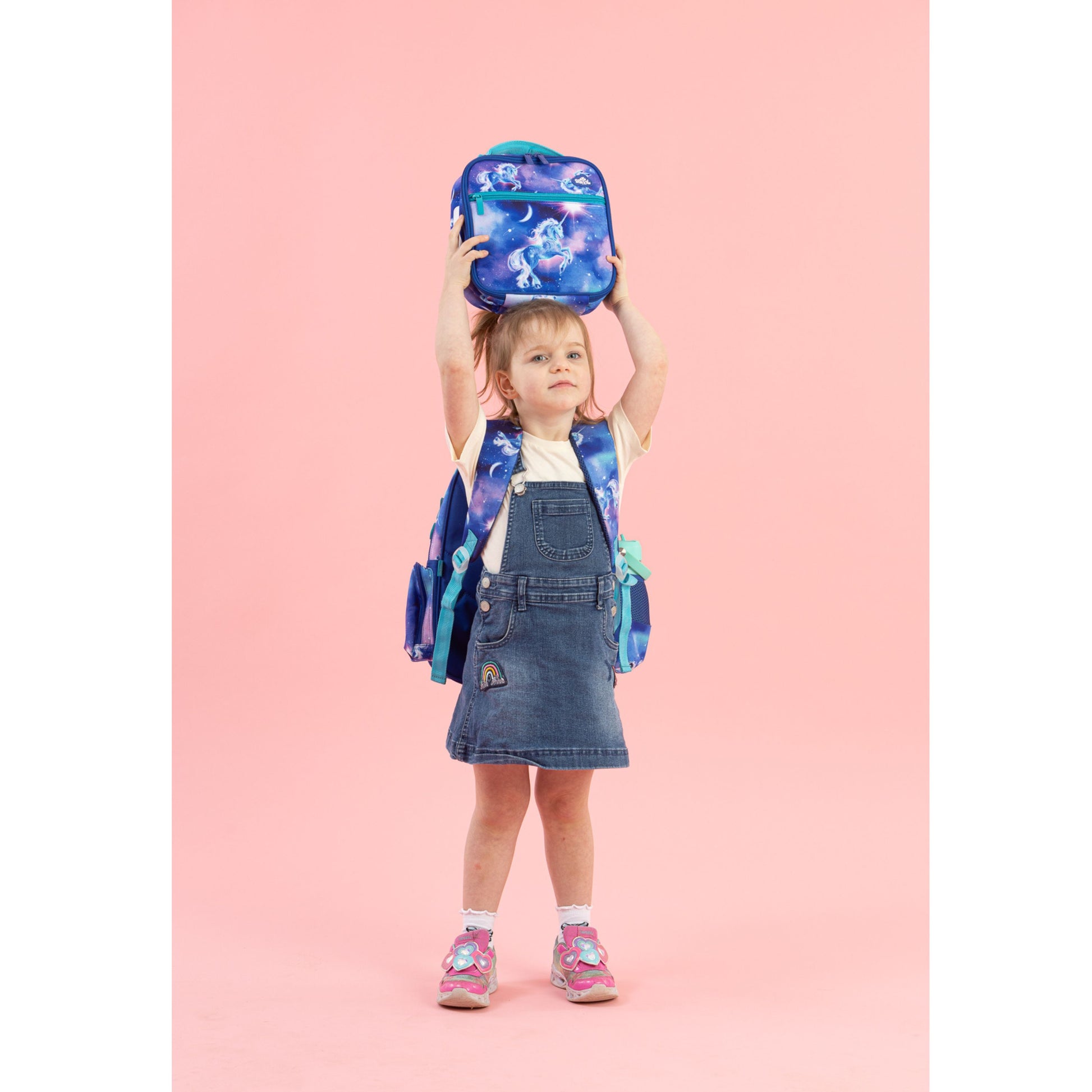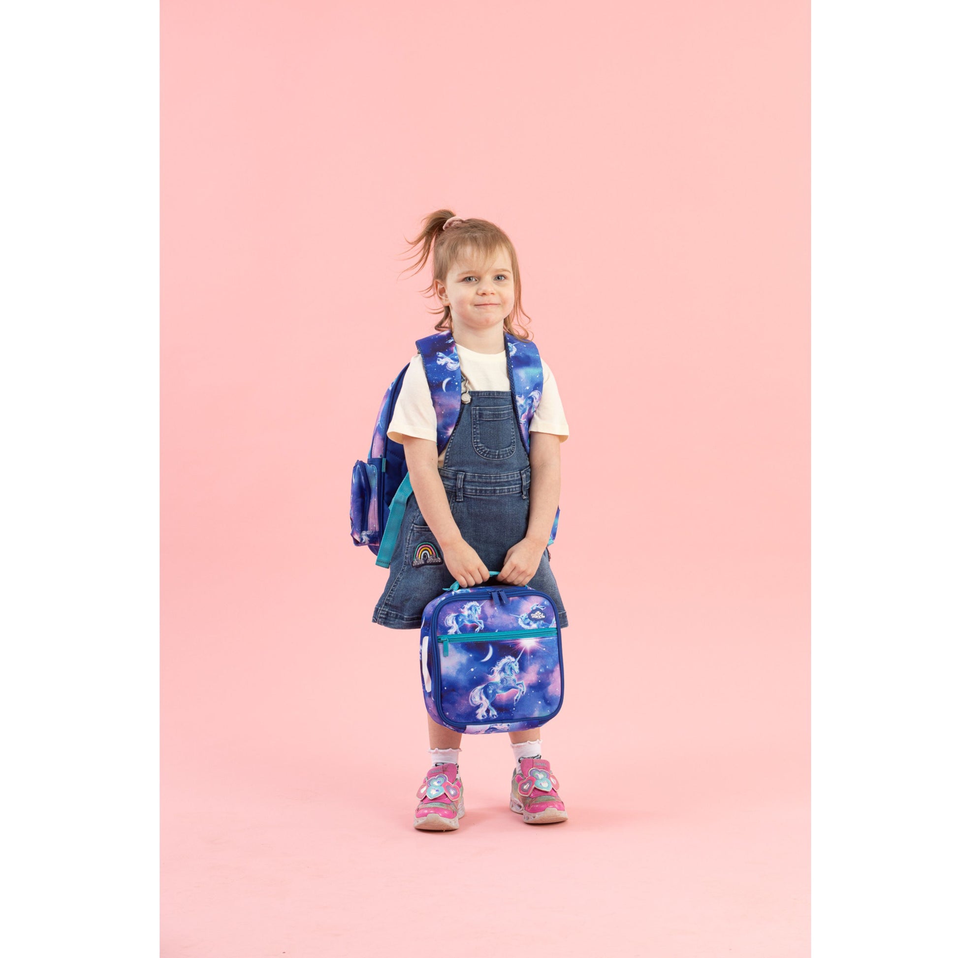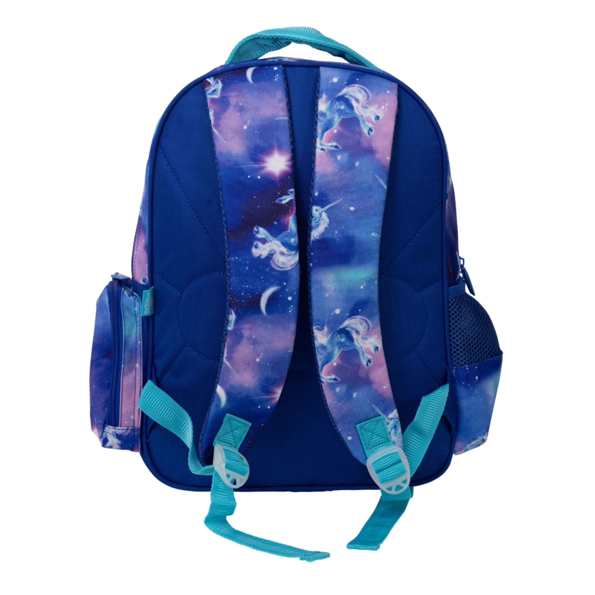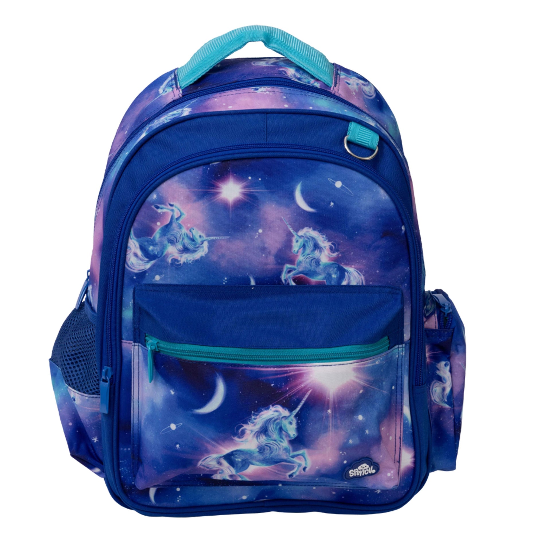 Under a starlit sky, magic comes to life! Moonlit Unicorn is a dreamy swirl of twilight colours, sparkling stars and one truly majestic unicorn. It’s pure enchantment for kids who believe in a universe full of wonder. Little kids need little products, like this perfectly sized Little Backpack for growing bodies! A new and improved design, you'll love the updated features such as a side zip pocket, D-loop for attaching bag tags or keychains and a padded top carry handle for little hands. It also sports a water bottle compartment, a compartment with laptop/tablet holder and middle zipped pocket for lunch bags and lunch boxes making this bag both super cute AND practical! KEY FEATURES Adjustable back straps Front pocket for easy access items Mesh side pocket for drink bottles Top Handle for hanging. CARE INSTRUCTIONS The Spencil Little Backpack is machine washable. We recommend machine washing only sparingly (once or twice a year) to give your backpack the longest life. For the best protection, put it in a washing bag or pillowcase before it goes in the machine. In between washes, use a wet sponge to clean out all the pockets. The bag should be dried thoroughly, best in the sun, before being packed and used again.
