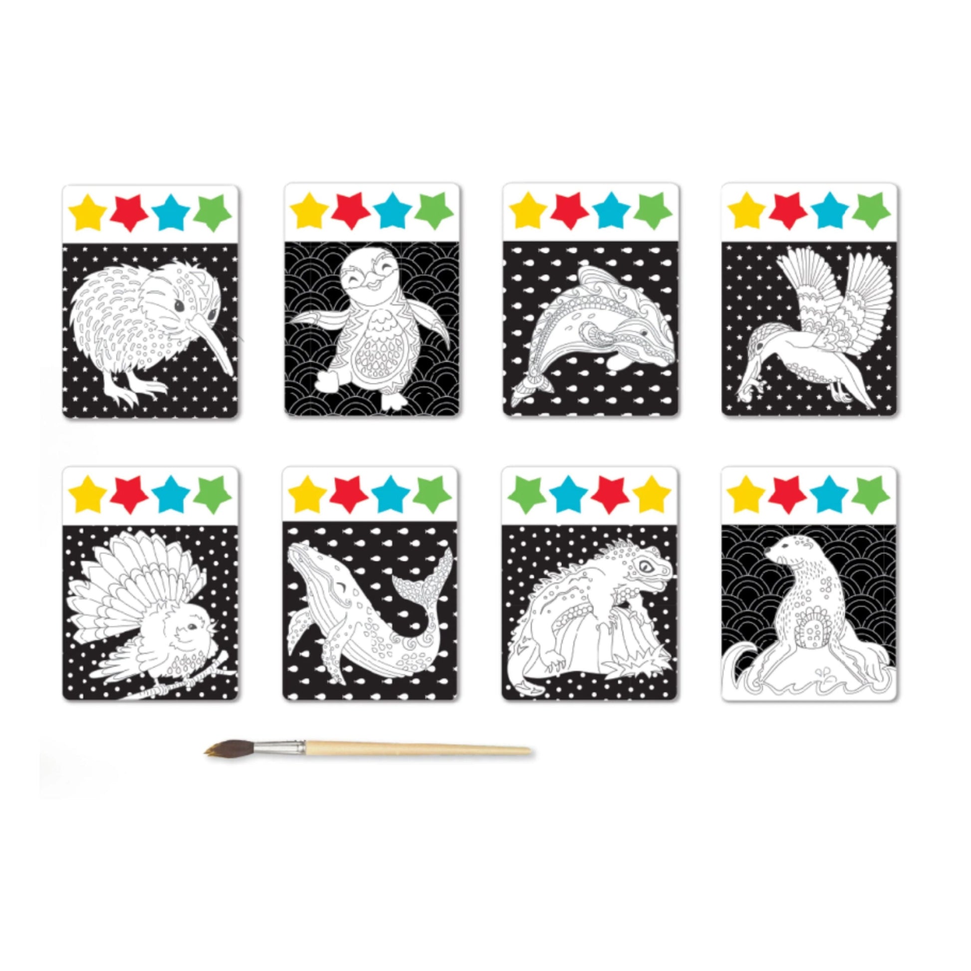 Hours of mess free entertainment, all packed into one box! This "Totally Mini" New Zealand wildlife water colour art set is loads of fun. Use the paint brush and water colour stars to paint your very own NZ wildlife art.