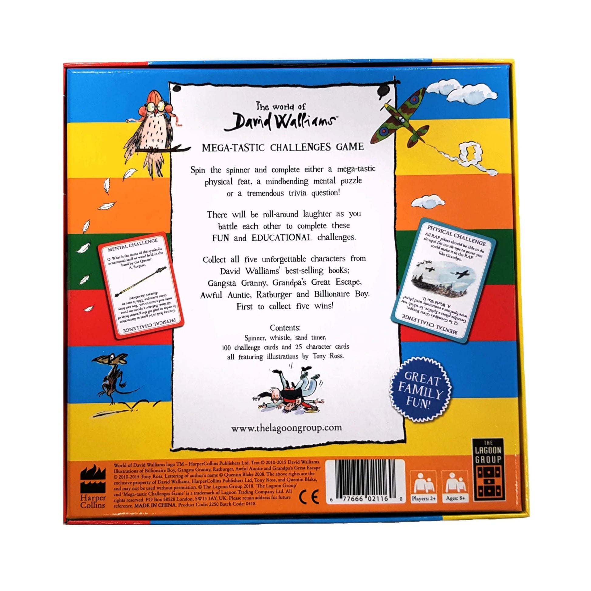 "For all fans of David Walliams stories, The World of David Walliams Mega-tastic Challenges Game is a brilliantly, entertaining board game for the whole family. Inspired by the storybooks of Britain's number 1 author and with the iconic illustrations from Tony Ross, players spin the spinner and have to successfully complete either mental or physical challenges in order to collect cards of some of David Walliams’ best-loved characters. All the challenges are based around the plots and characters in the books and players need to collect all five character cards in order to be the mega-tastic champion! An educational game to encourage learning through play as well as fantastically good fun for all the family, the best-selling Mega-tastic Challenges Game is the perfect entertainment for players aged 8-108!
