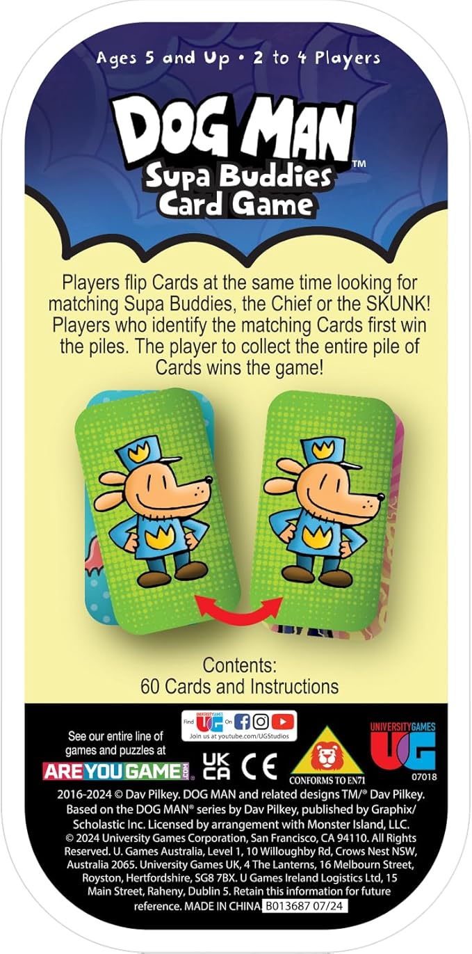 "Based on Dav Pilkey’s Dog Man books series, the Dog Man Supa Buddies Card Game is a fast-paced and portable game for kids 5 and up and their families.