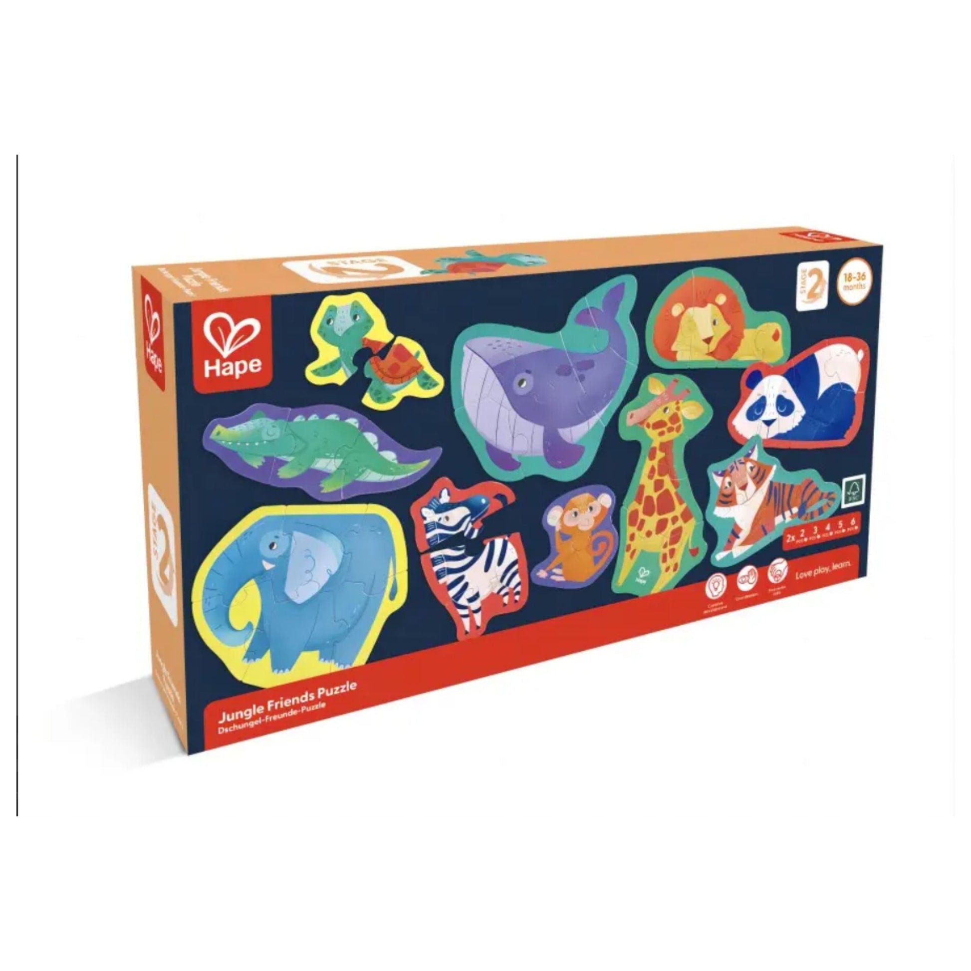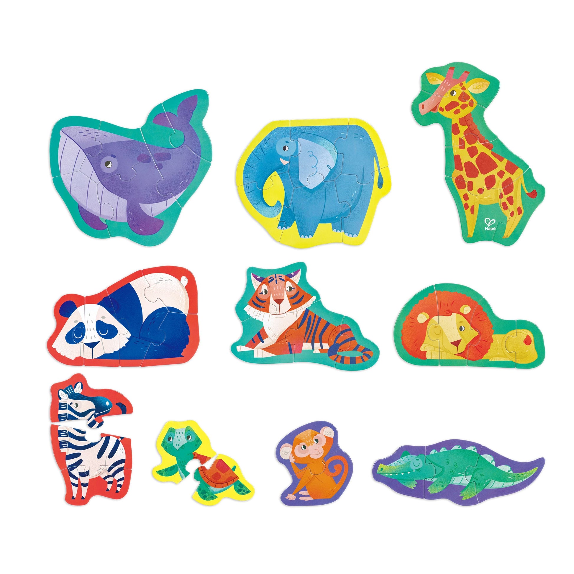 Experience the thrill of the wild with our captivating wild animal puzzle set. Piece together majestic creatures and unravel nature`s wonders. As your puzzle maestro works on the jigsaws, encourage them to name the jungle animals they encounter. You can also make the sounds of each animal to make playtime more interactive and engaging. JUNGLE ADVENTURES: This puzzle set includes ten exotic animal jigsaw puzzles in the shape of a zebra, giraffe, whale, panda, lion, tiger, monkey, turtle, elephant and crocodile.